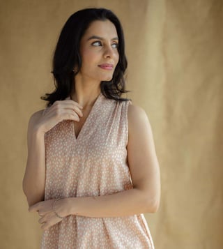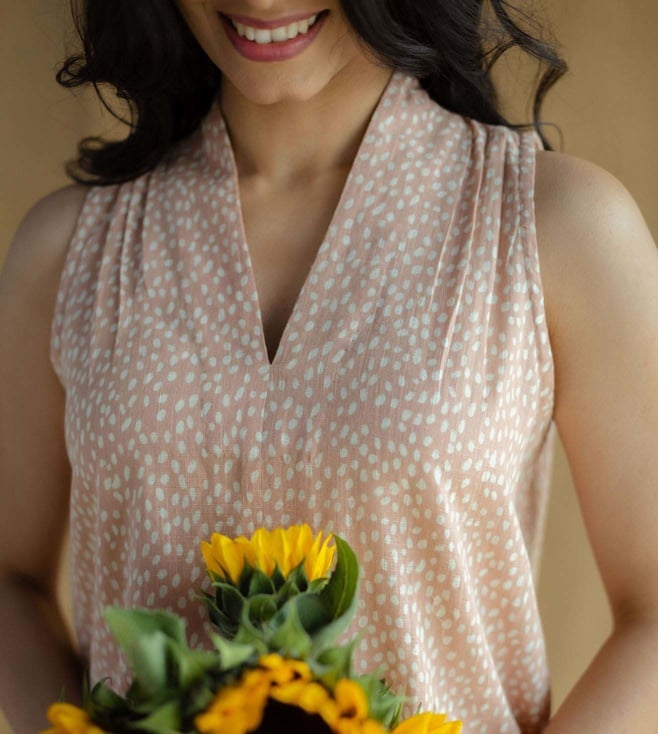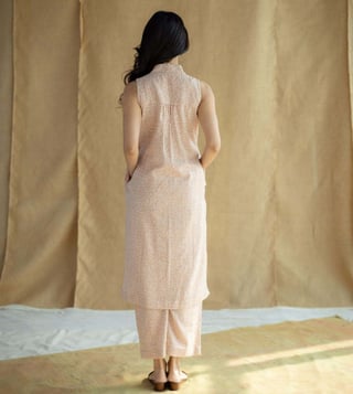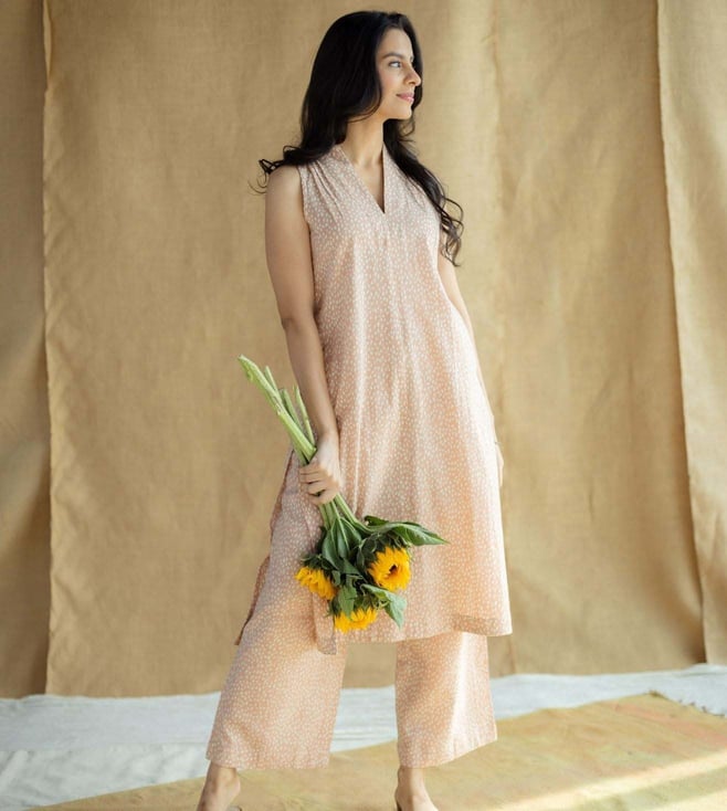 Slay the look by wearing this peach a-line fit sleeveless kurta from The Indian Ethnic Co Delilah. Tailored to sartorial perfection from premium quality fabric, it assures a soft and soothing touch against the skin. The V-neckline adds to its appeal. The printed pattern makes it a captivating choice.