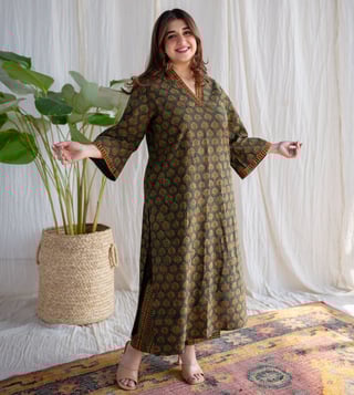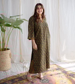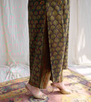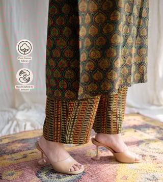Elevate your wardrobe with The Indian Ethnic Co Green Straight Ajrakh Cotton Pant. These stylish pants are crafted from soft cotton with intricate Ajrakh prints, offering a straight silhouette for a comfortable fit. The vibrant green hue adds a fresh vibe, perfect for pairing with kurtas or tops. Ideal for casual or festive looks, celebrate traditional craftsmanship with these versatile pants, designed for effortless style and timeless elegance.