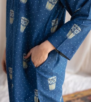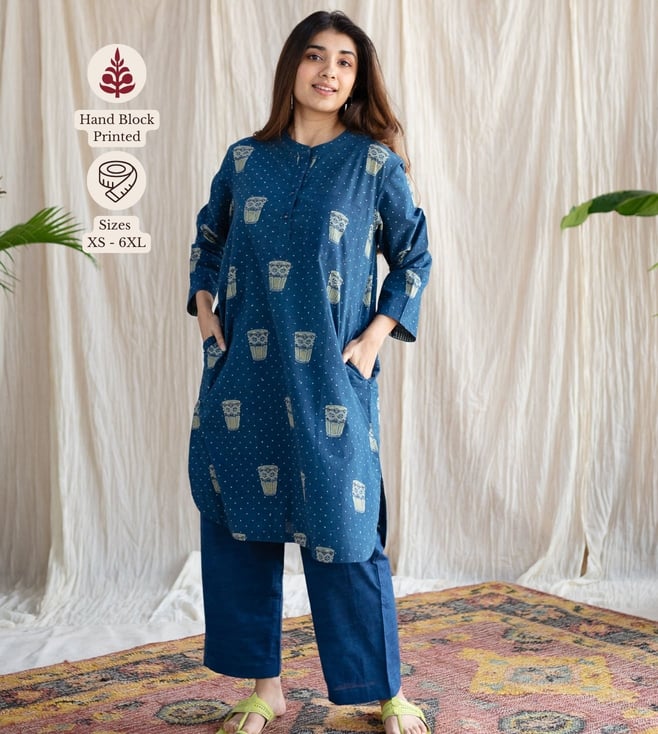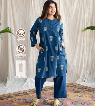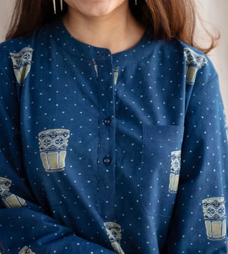 Discover elegance with The Indian Ethnic Co Indigo Straight Ajrakh Handblock Printed Cotton Kurta. This chic kurta features a flat mandarin collar and full sleeves, crafted from soft cotton with intricate Ajrakh prints. The straight silhouette ensures comfort, while the indigo hue adds timeless charm. Perfect for casual or festive occasions, pair it with palazzo pants or churidar. Celebrate traditional craftsmanship with this versatile kurta, designed for effortless elegance.