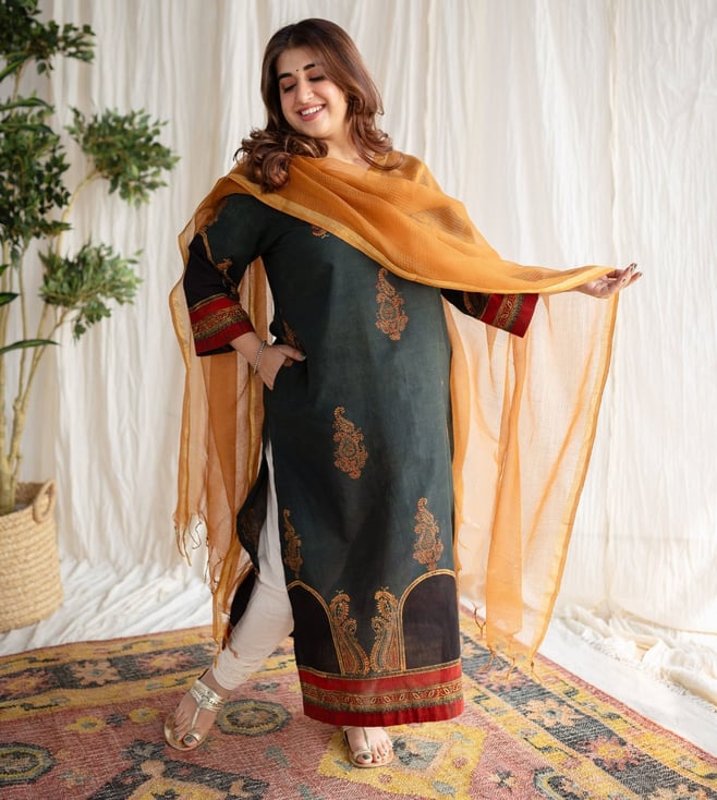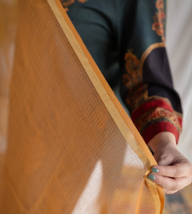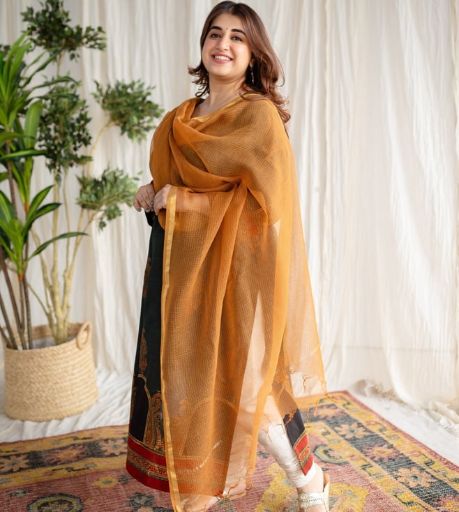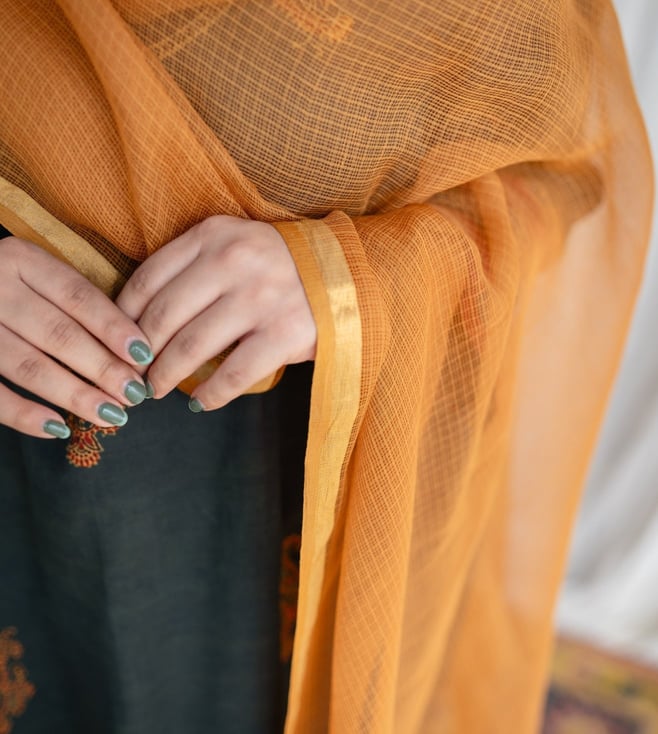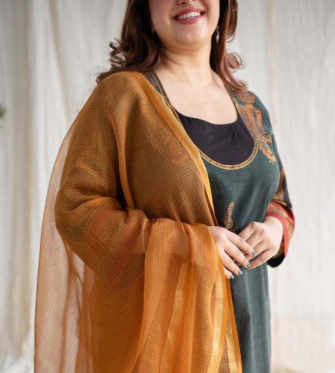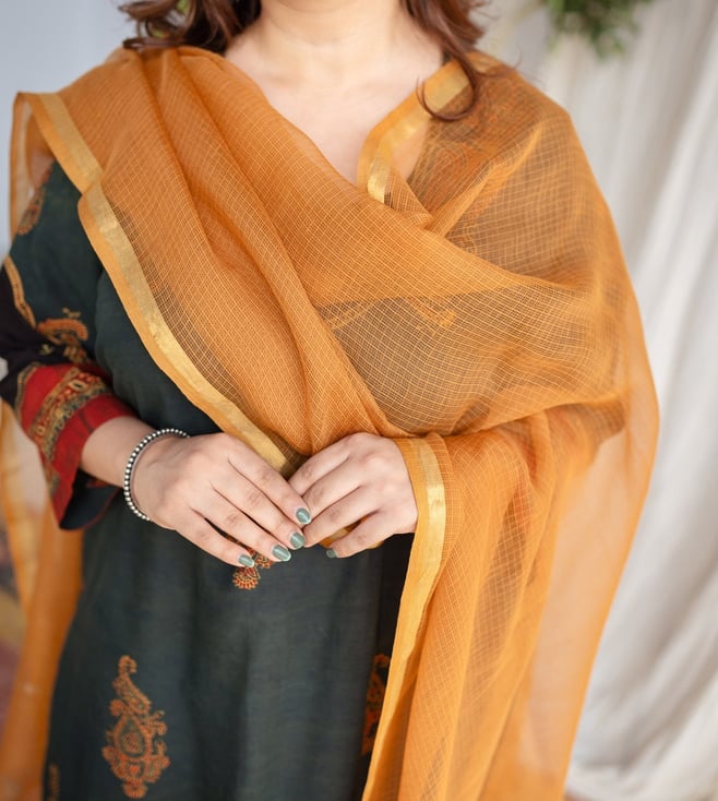 The Indian Ethnic Co Mustrad Kota Doria Cotton Dupatta with Gold Zari Border