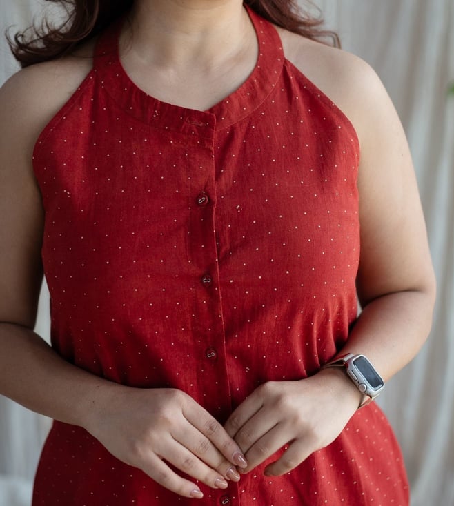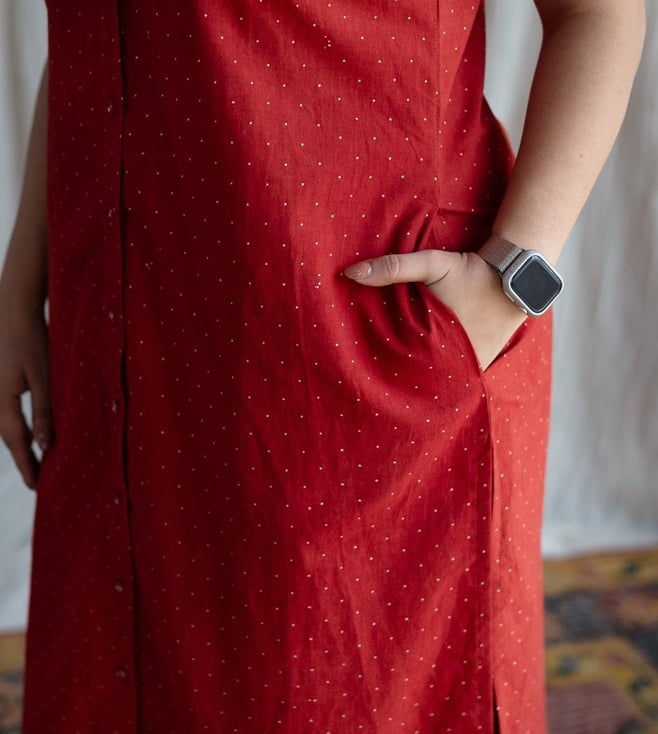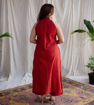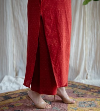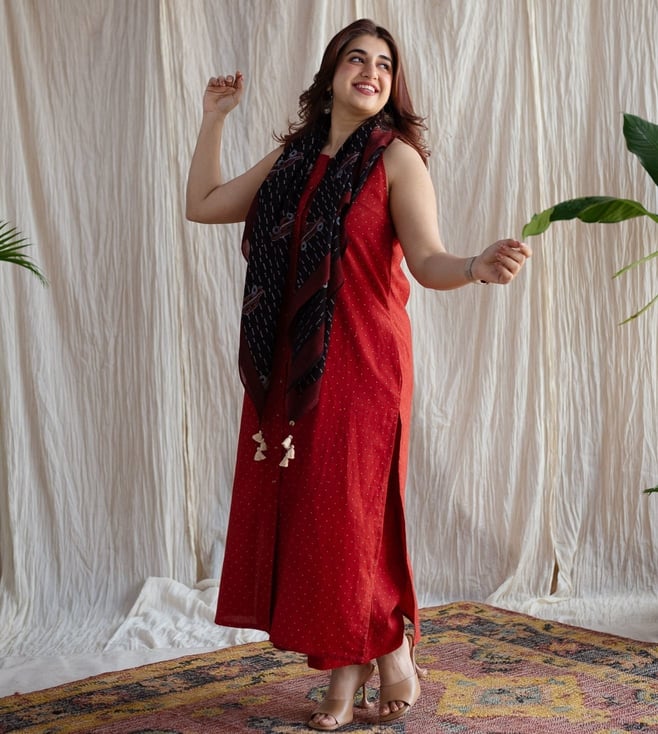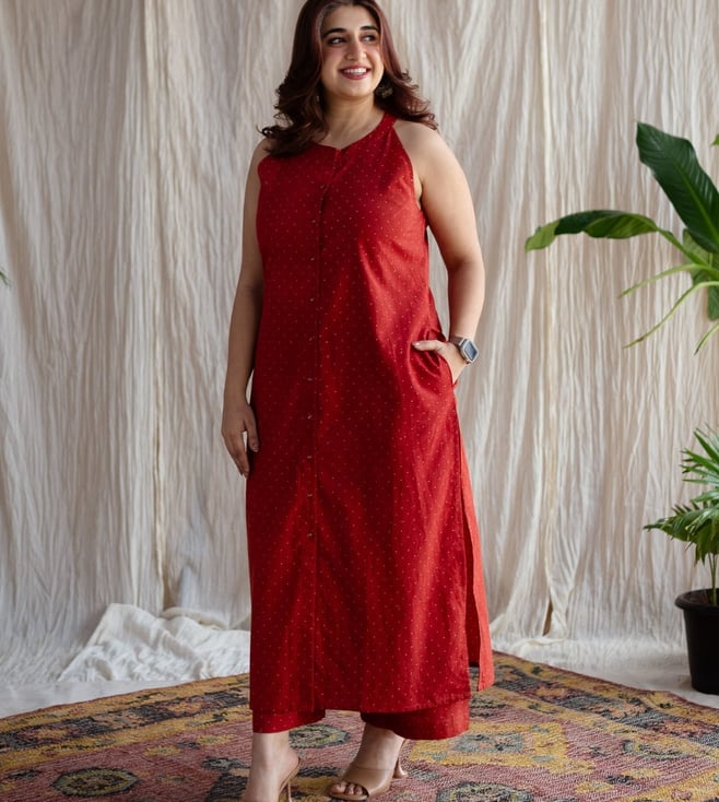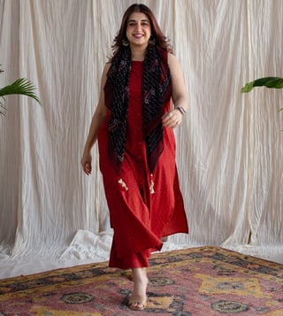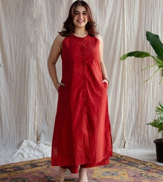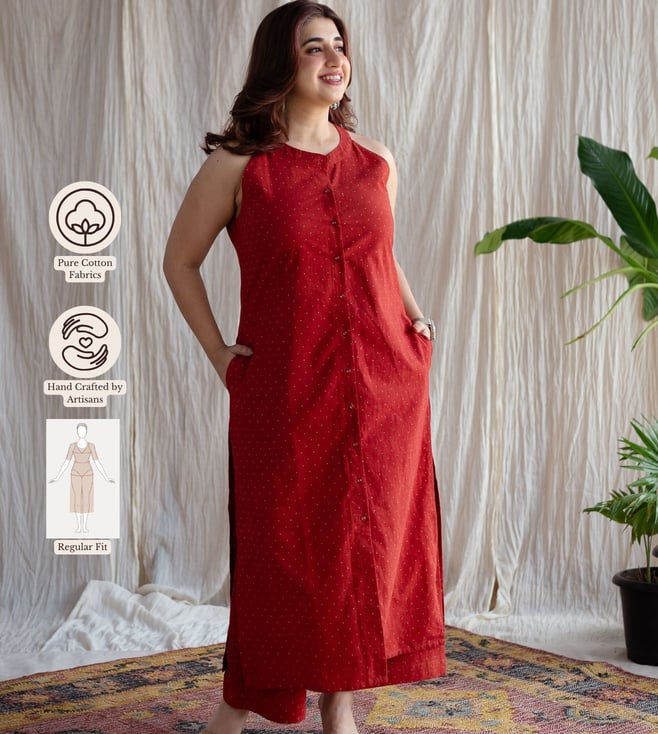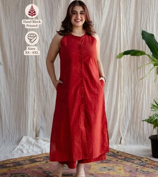 Embrace timeless style with The Indian Ethnic Co Red Straight Ajrakh Handblock Printed Cotton Kurta. This elegant kurta features a flat mandarin collar and sleeveless design, crafted from soft cotton with intricate Ajrakh prints. The straight silhouette ensures comfort, while the red hue adds vibrancy. Perfect for casual or festive occasions, pair it with palazzo pants or churidar. Celebrate traditional craftsmanship with this versatile kurta, designed for effortless elegance.