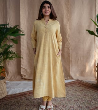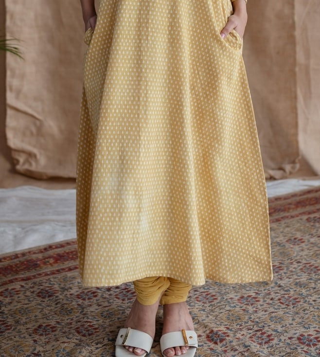 The Indian Ethnic Co Yellow Solid Dabu Narrow Slub Cotton Chudidar