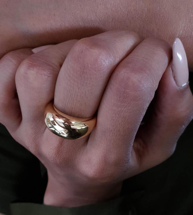Saying yes was never so easy and this ring is a yes magnet. The ring is super simple yet an extremely impactful piece. The elegant dome-like design will stand the test of time. This ring pairs with almost any yellow plated jewellery or on any outfit. It's a wardrobe must-have. It is created with care using 18 kt gold-plated brass. Disclaimer: All other items in the image are only for display purposes and will not be a part of the delivery content. Country Of Origin - India.