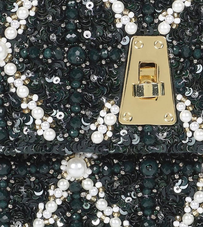 Make way for this mini bag which is unique and classy. It is a part of the Glory collection. It is embedded with glam sequins and graded pearls forming beautiful designs. This mini bag is a wardrobe essential as it comes with a chain handle and is adorned with hardware. It has been designed with care using leather. Disclaimer: Product colour may slightly vary due to photographic lighting sources. Country of Origin - India.