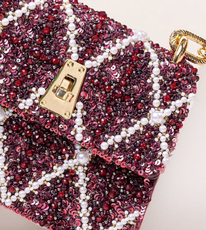 Make way for this mini bag which is unique and classy. It is a part of the Glory collection. It is embedded with glam sequins and graded pearls forming beautiful designs. This mini bag is a wardrobe essential as it comes with a chain handle and is adorned with hardware. It has been designed with care using leather. Disclaimer: Product colour may slightly vary due to photographic lighting sources. Country of Origin - India.