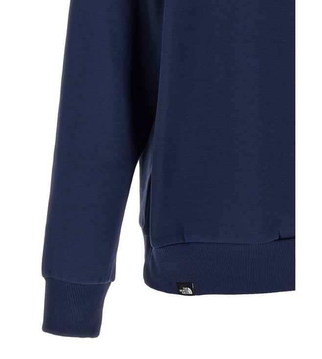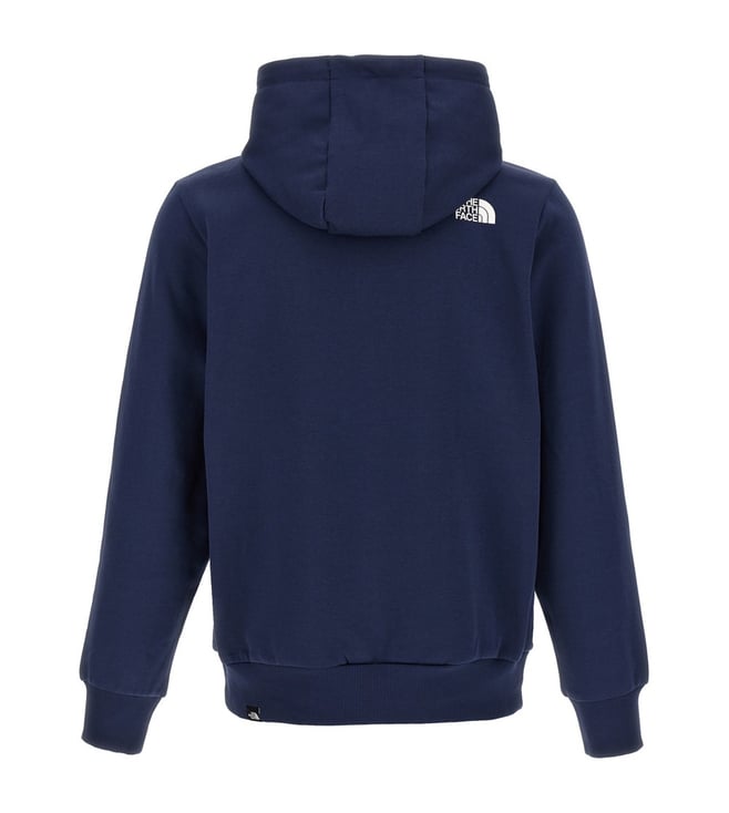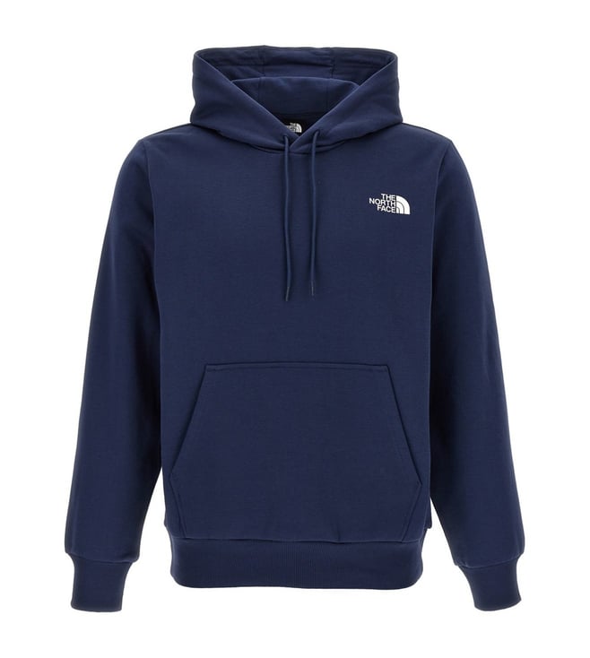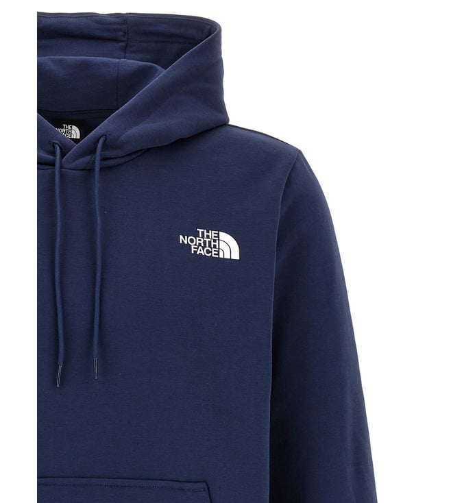 Elevate your style with the North Face Navy Blue Hoodie. Simple' cotton blend hoodie with front and back print, kangaroo pocket, long cuffed sleeves. True to size fit.