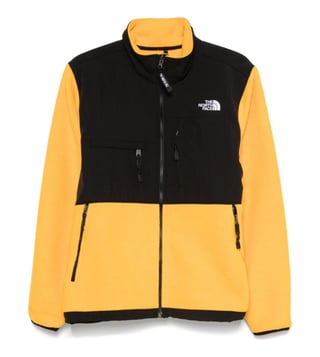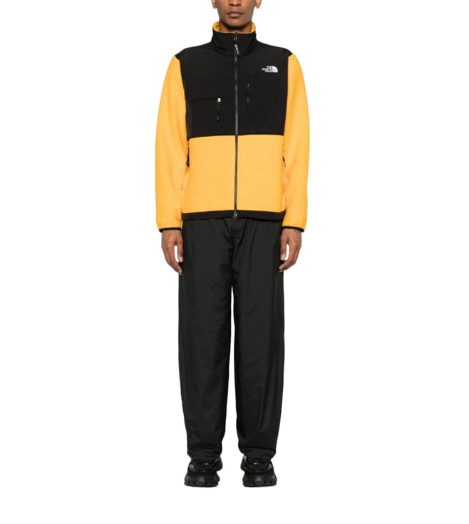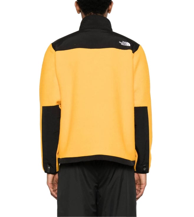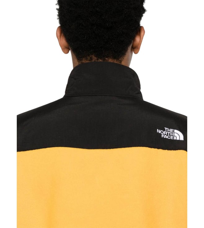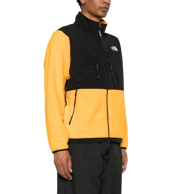Elevate your style with the The North Face Yellow Golden Logo Fleece Colorblock Jacket. Sunflower yellow/black fleece texture panelled design front zip fastening high neck long sleeves zip detail embroidered logo at the chest two zipfastening chest pockets two side zipfastening pockets internal drawstring fastening waist.