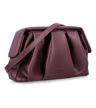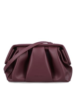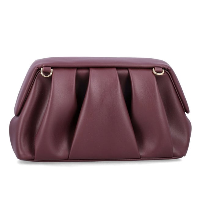 Maroon pleated clutch, magnetic closure, 1 compartment, solid, front logo, removable adjustable crossbody strap.