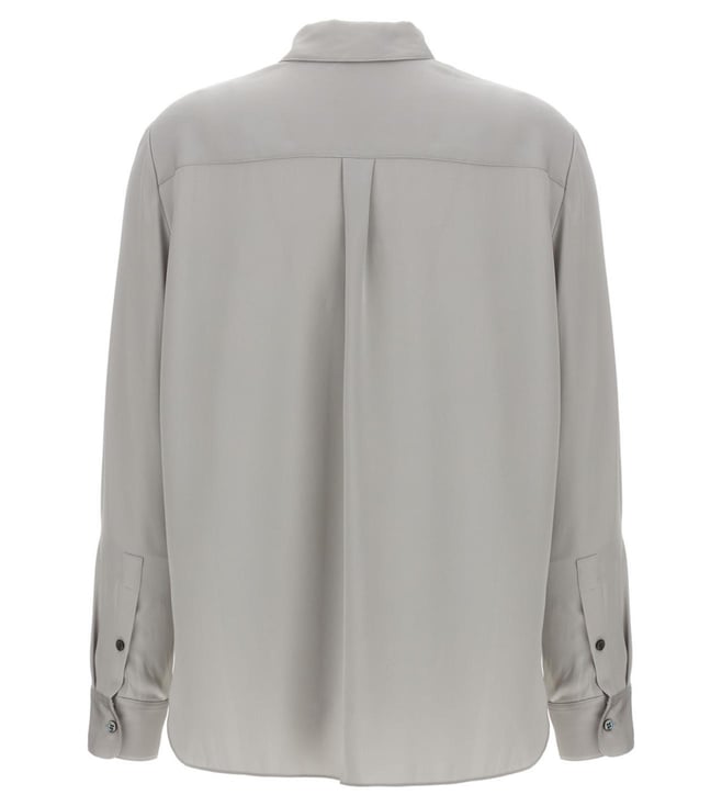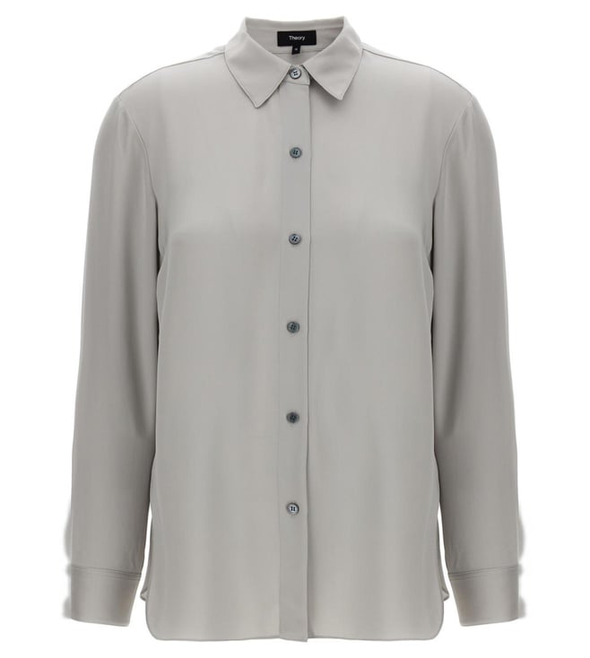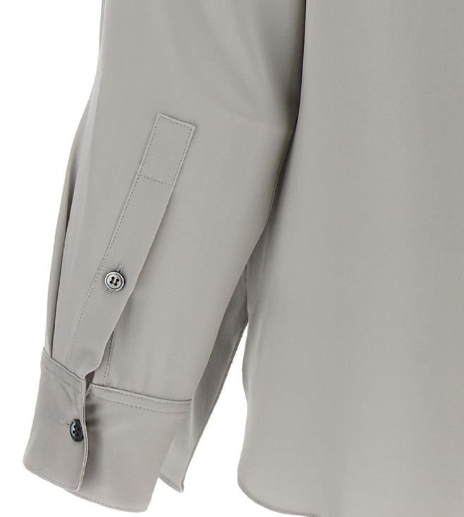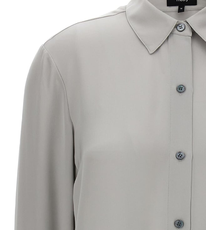 Elevate your wardrobe with this exquisite grey casual shirt, crafted from 100% silk for a luxurious feel. Its solid pattern exudes timeless elegance, while the long sleeves and classic shirt collar offer a sophisticated silhouette. Designed for the modern woman, this shirt features a seamless closure that enhances its sleek profile. Perfect for any occasion, its versatile hue and sumptuous fabric make it a staple piece, effortlessly blending comfort with style for a chic, polished look.