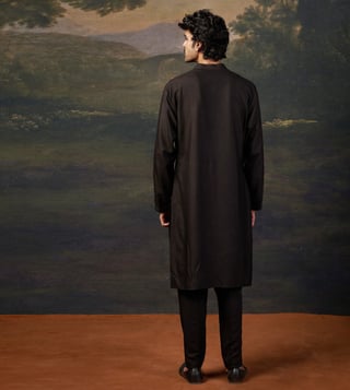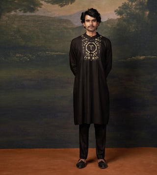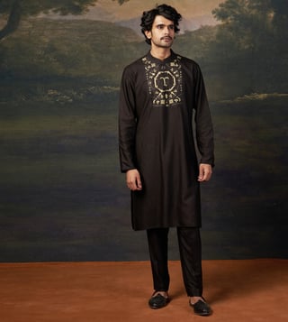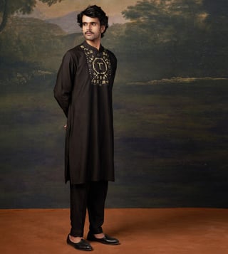 A perfect blend of sophistication and tradition, this zari hand-embroidered black kurta set is designed to make a statement. The intricate embroidery enhances the rich black hue, creating an effortlessly elegant look for any occasion. Comfort & Fit: Designed with a structured yet relaxed fit for ease of movement. Additional Details: Material: Premium Pure Silk, Santoon No. of Components: 2 (Kurta & Pyjama) Care: Dry Clean Only Delivery Time: 10-15 Days