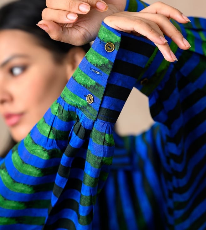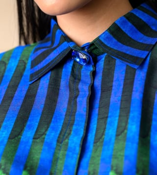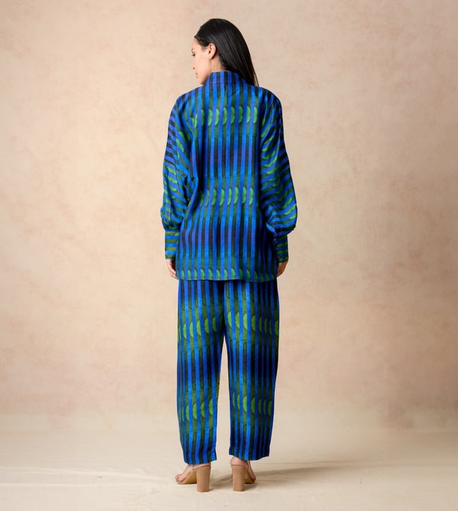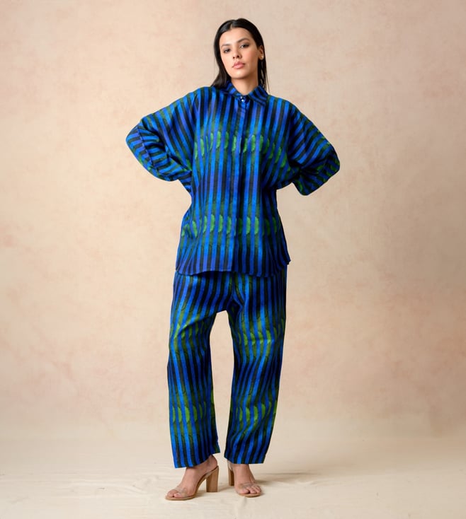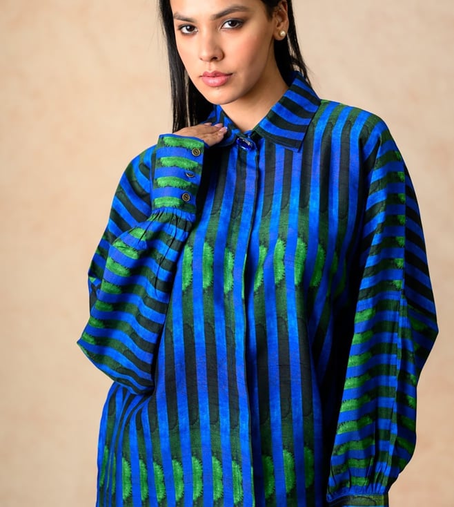 Embrace effortless elegance in this captivating co-ord set. Crafted from luxurious cupro silk, the fabric drapes beautifully, creating a soft and fluid silhouette. The santoon pattern adds a touch of whimsy with its delicate stripes, while the full sleeves and shirt collar lend a classic touch. The cool blue hue evokes a sense of tranquility and sophistication, making this set perfect for both casual and semi-formal occasions.