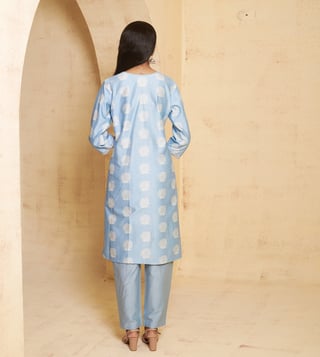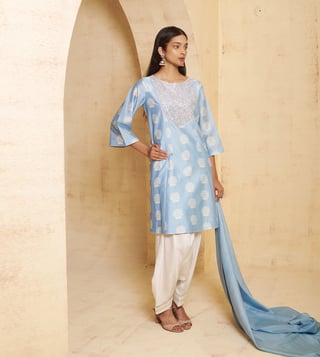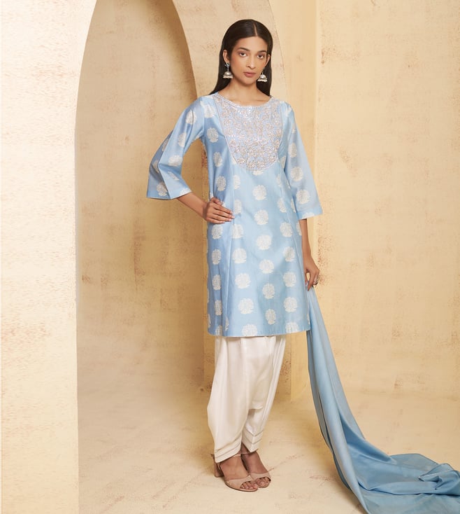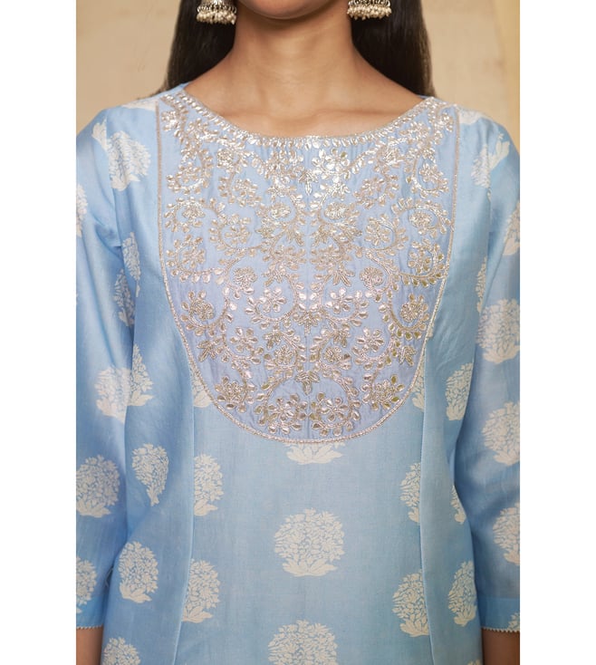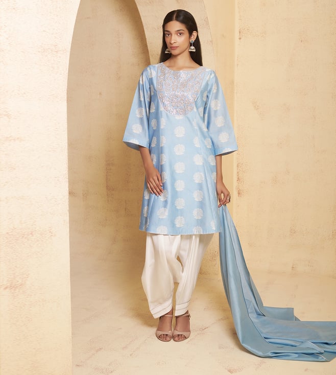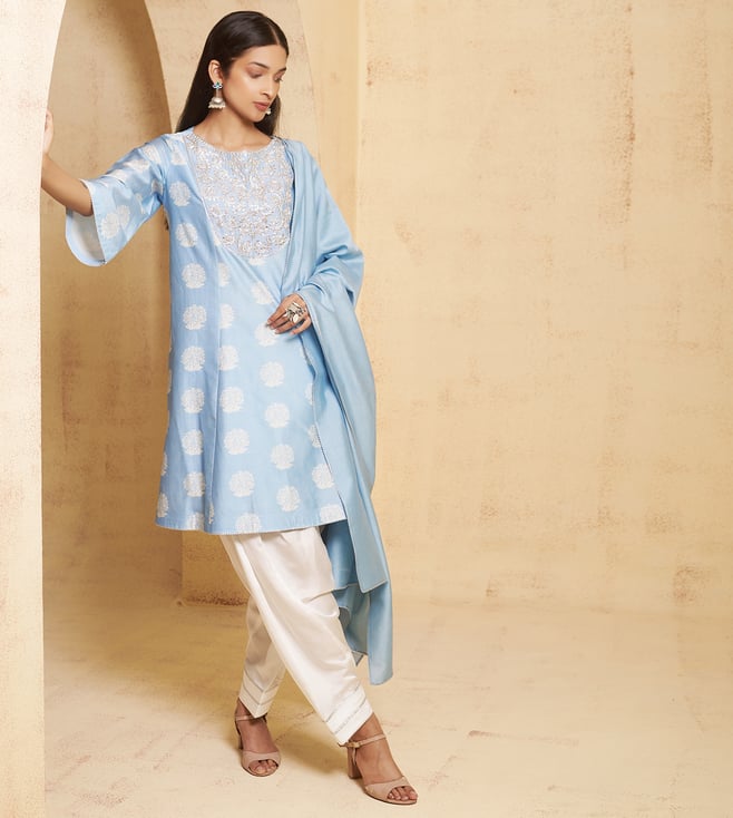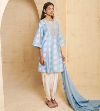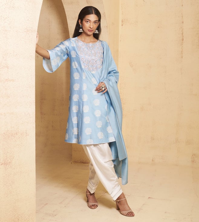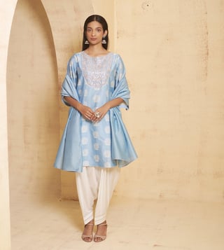 THETAA Blue White Chanderi Relaxed Fit Floral Anarkali Set