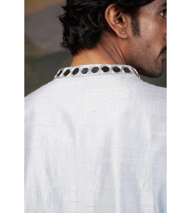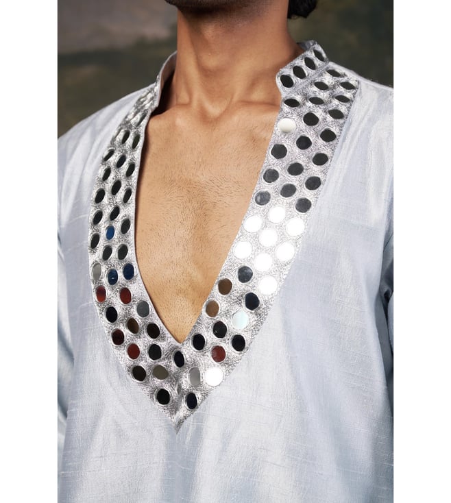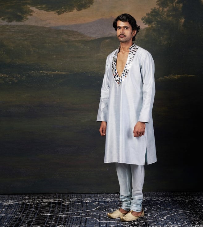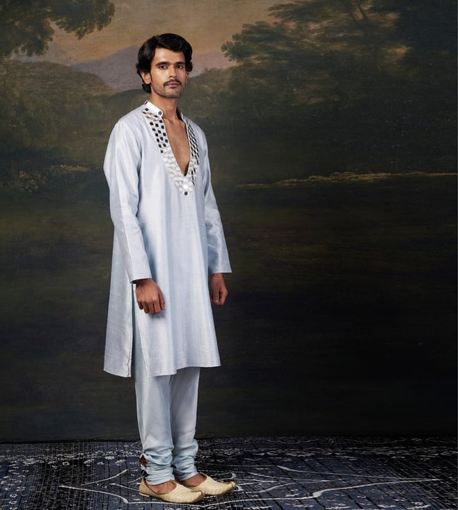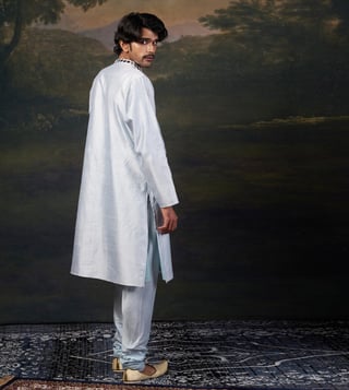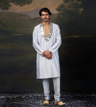 A perfect blend of tradition and contemporary elegance, this hand embroidered mirror work kurta set is designed to make a statement. The intricate hand-embellished mirror work adds a dazzling touch, making it ideal for weddings, festive occasions, and cultural celebrations. Comfort & Fit: Designed for ease of movement with a structured yet relaxed fit. Additional Details: Model Size: Height 6 ft, wearing size L Material: Premium Pure Silk, Santoon No. of Components: 2 (Kurta & Pyjama) Care: Dry Clean Only Delivery Time: 10-15 Days