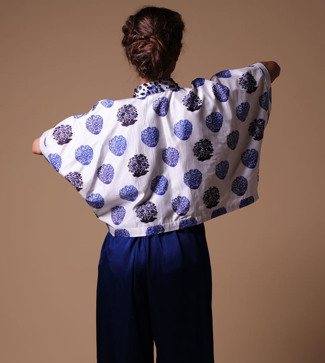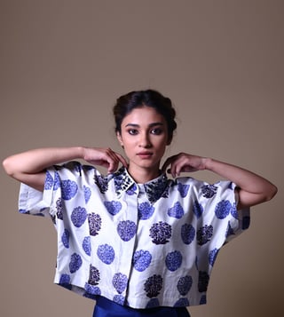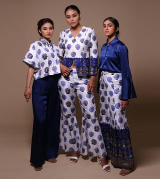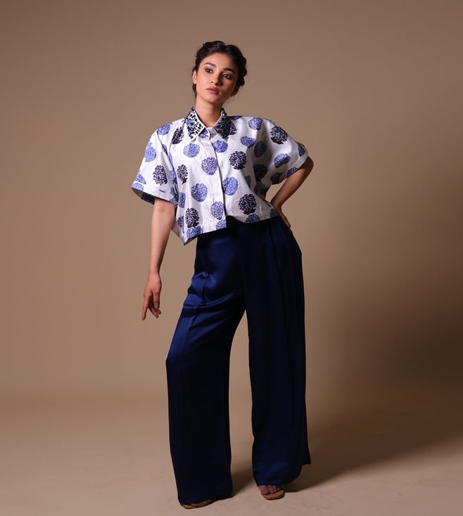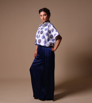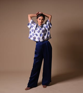 THETAA Blue & White Silk Relaxed Fit Floral Co-Ord Set