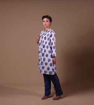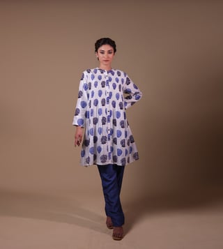 Chic pintuck kurti with delicate hand embroidery, paired with matching tapered pants. Crafted in pure silk and viscose for comfort and elegance.