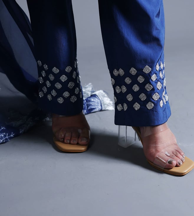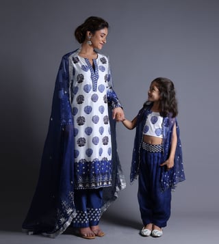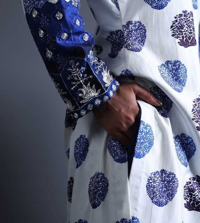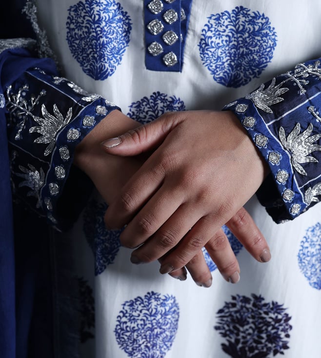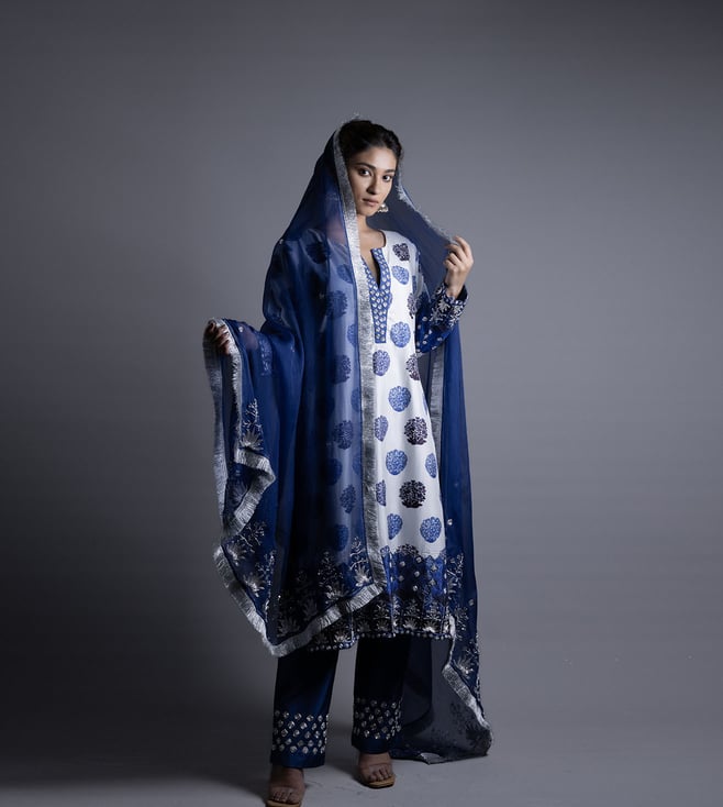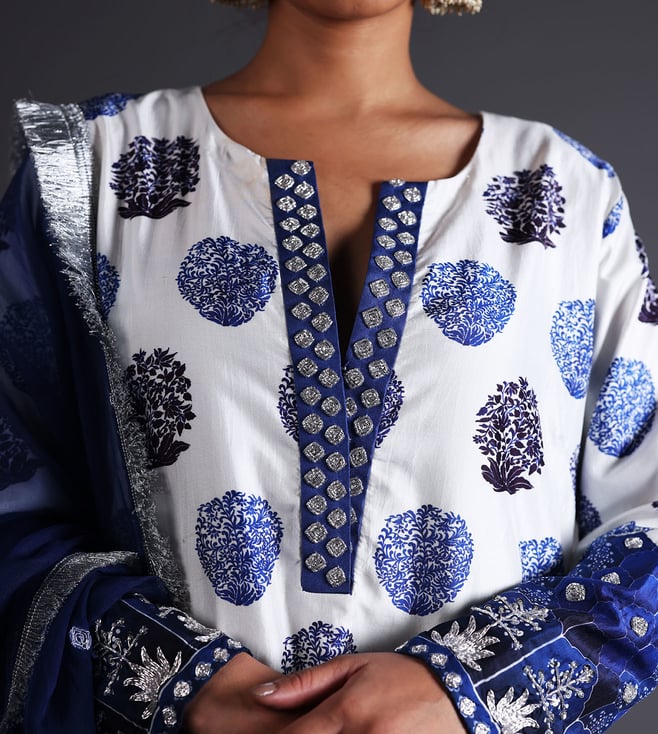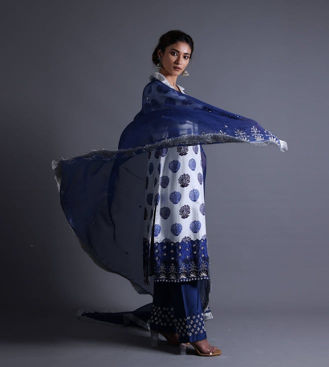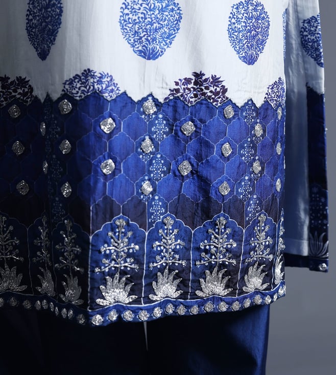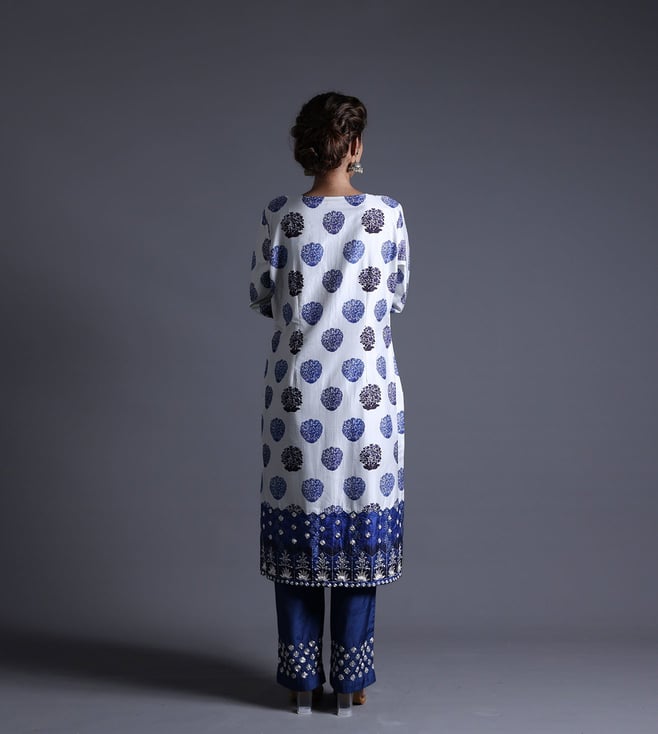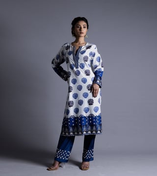THETAA Blue & White Silk Relaxed Fit Floral Suits Set