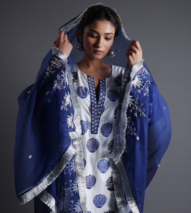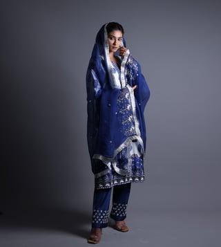 Elegant kurta with stunning zardosi hand embroidery, paired with tailored pants featuring embroidered borders and an organza dupatta with delicate lace. Crafted in pure silk and organza.