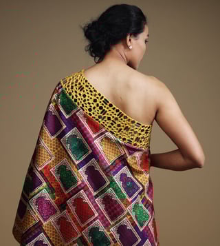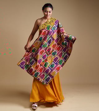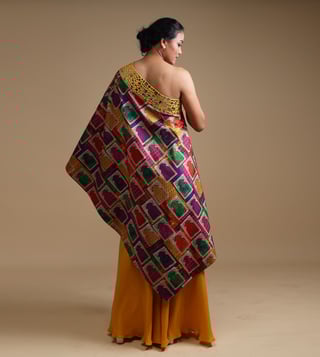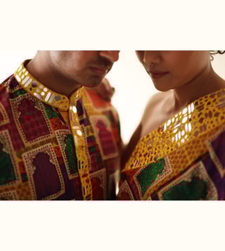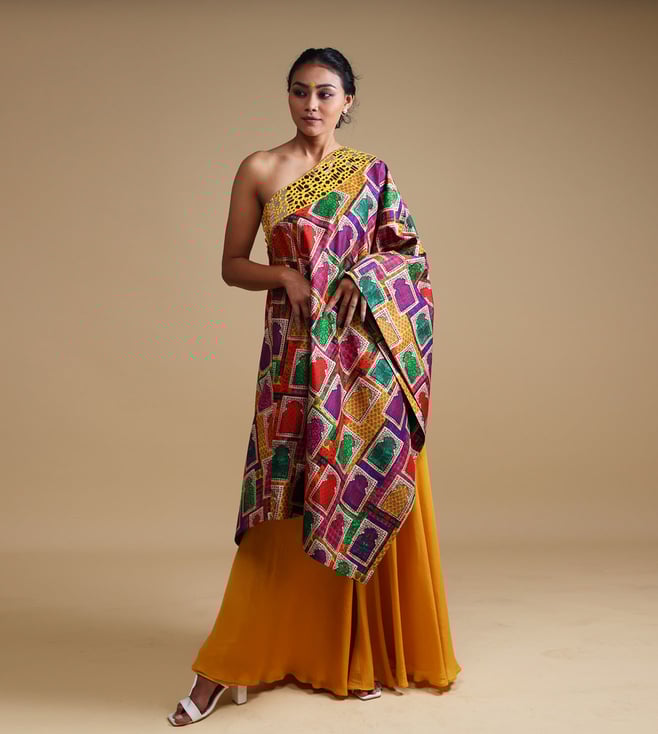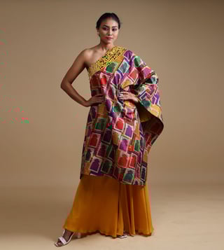 Chic off-shoulder kurta with sparkling mirror work, paired with flared sharara¿perfect for Haldi ceremonies and festive occasions. Crafted in pure silk and viscose.