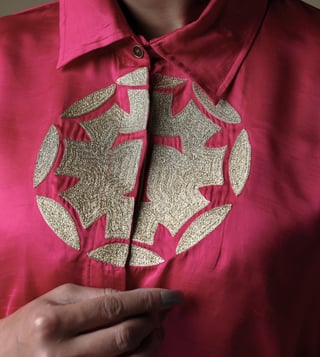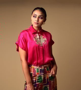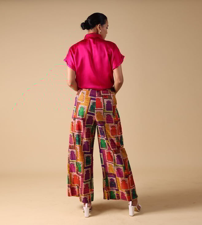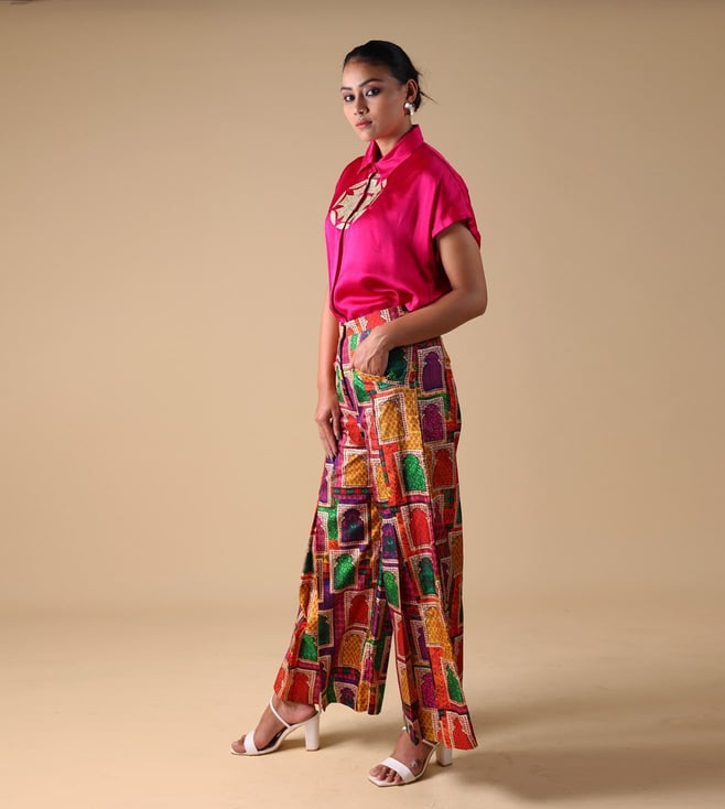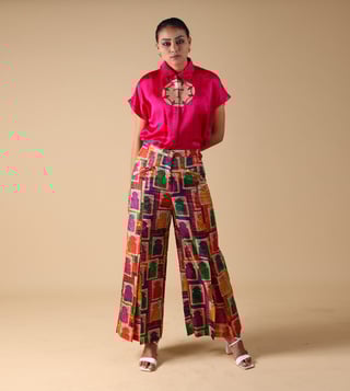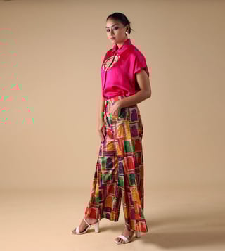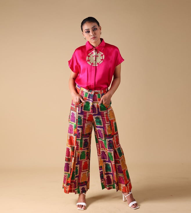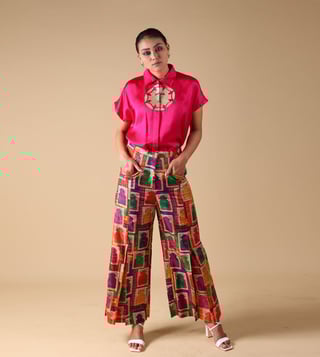 Hand-embroidered shirt paired with pleated pants featuring a striking jharokha print. A perfect blend of traditional artistry and modern style in pure silk.