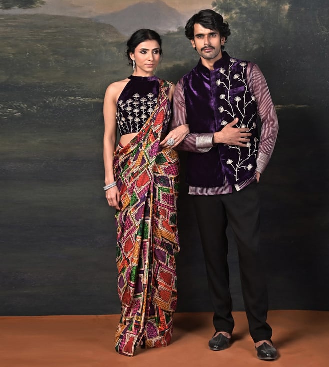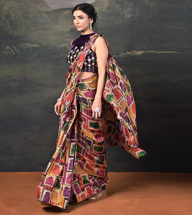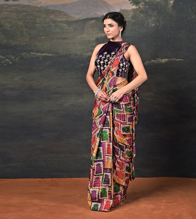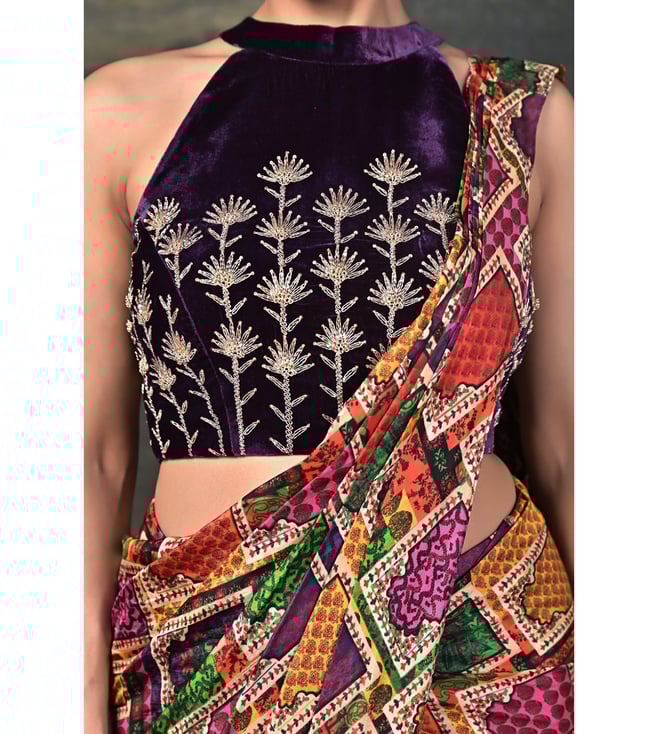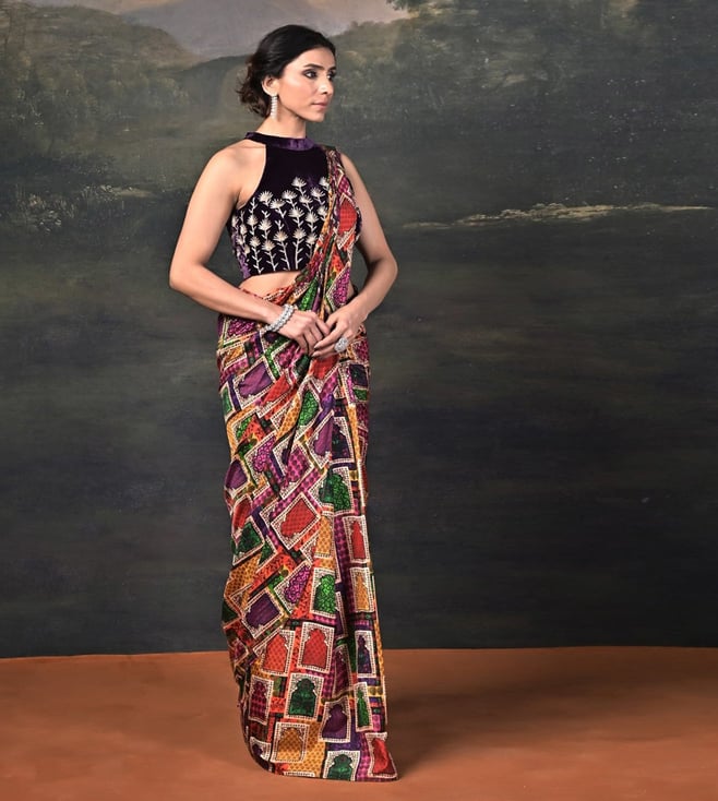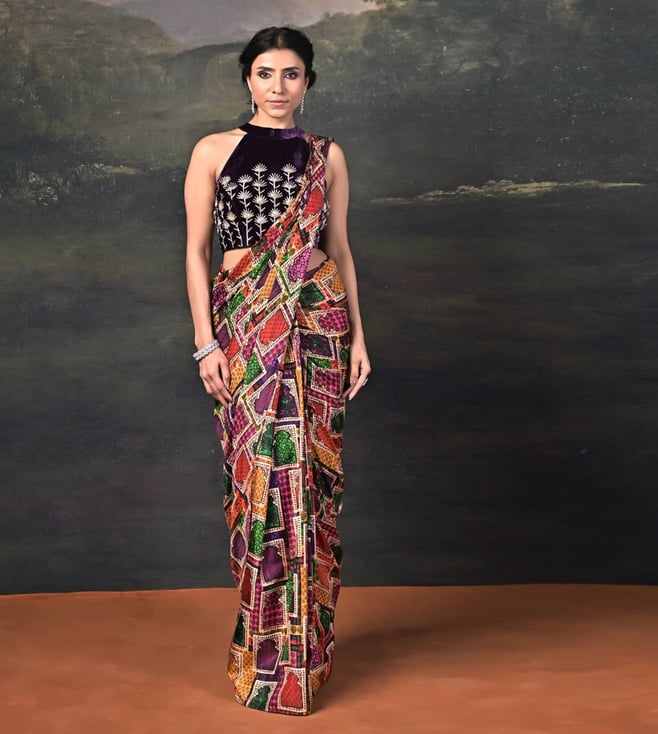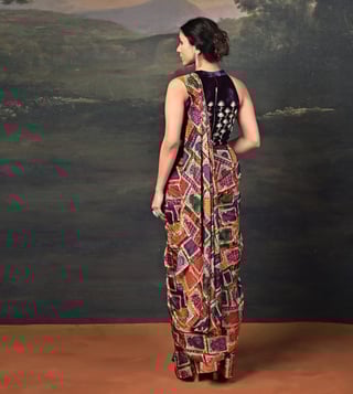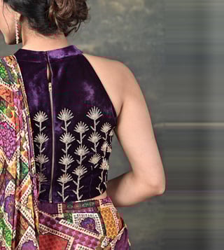 A fusion of luxury and elegance, this ensemble features a zardozi hand-embroidered halter neck velvet blouse, exuding richness and sophistication. Paired with a pure silk Jharoka copyright print pre-draped saree, it blends traditional artistry with contemporary ease. Comfort & Fit: Includes a 2-3 inch margin for future adjustments. Additional Details: Material: Velvet, Pure Silk, Satin, Santoon No. of Components: 2 (Blouse & Pre-Draped Saree) Model Size: Height 5'8", wearing size S Care: Dry Clean Only Delivery Time: 15 Days
