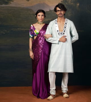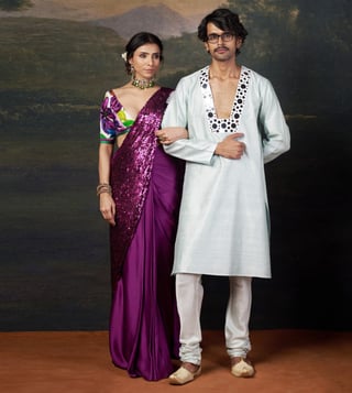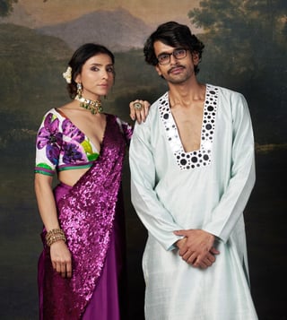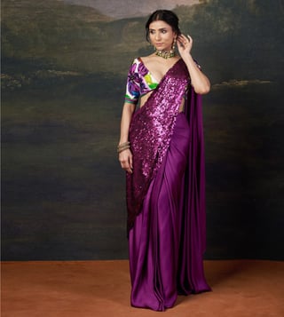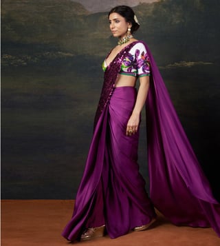 Hand-Embroidered Pre-Draped Saree with our copyright abstract floral print Intricate Hand Embroidery: Fully hand embrodiered blouse and pallu adds elegance and sophitication to the entire outfit. Abstract Floral Prints: A striking blend of tradition and contemporary aesthetics. Comfort & Adjustments: Extra 2-3 inches of margin for easy future alterations. Material: Pure Silk, Satin, Santoon No. of Components: 2 Model Size: Height 5'8", wearing size S Care: Dry Clean Only Delivery Time: 15 Days