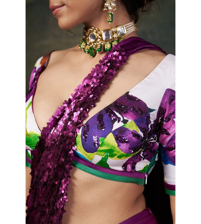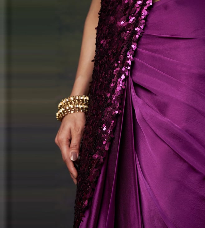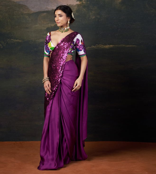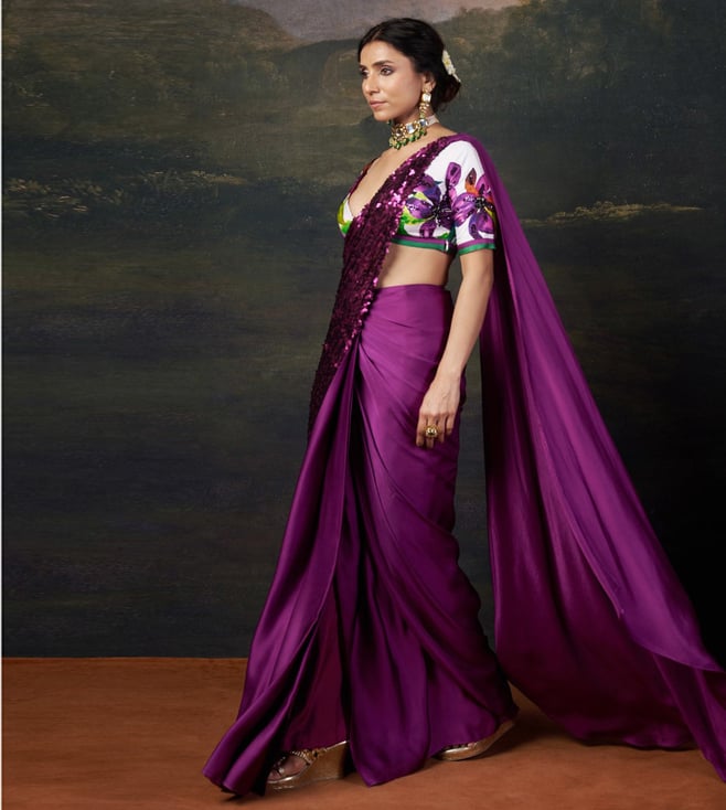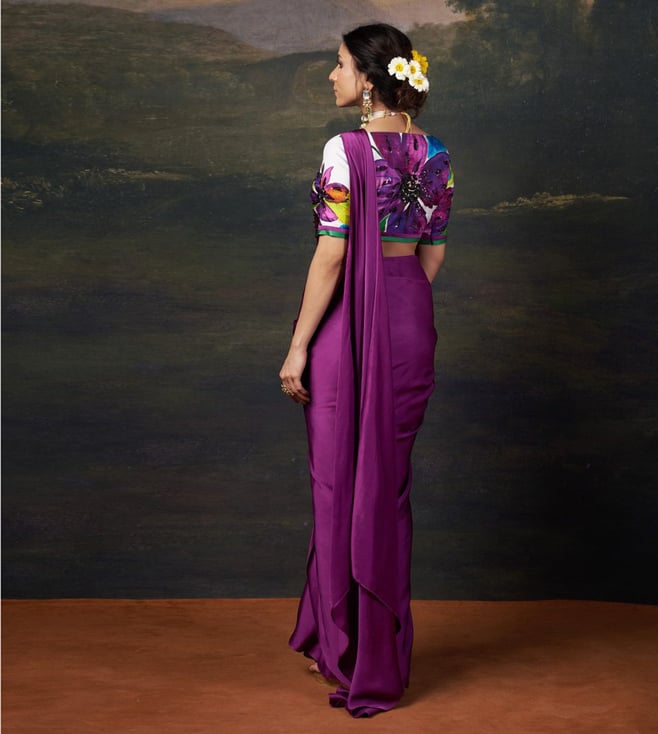 THETAA Purple Silk Slim Fit Floral Pre-Draped Saree