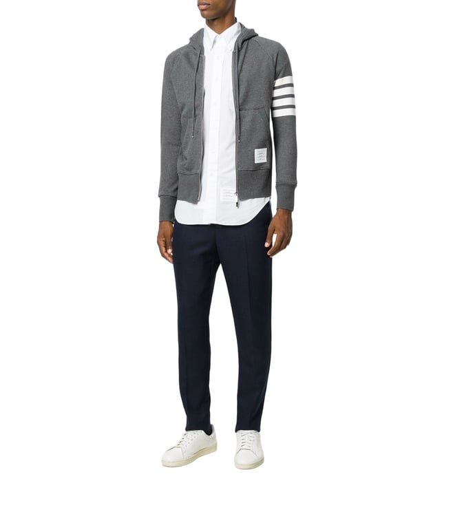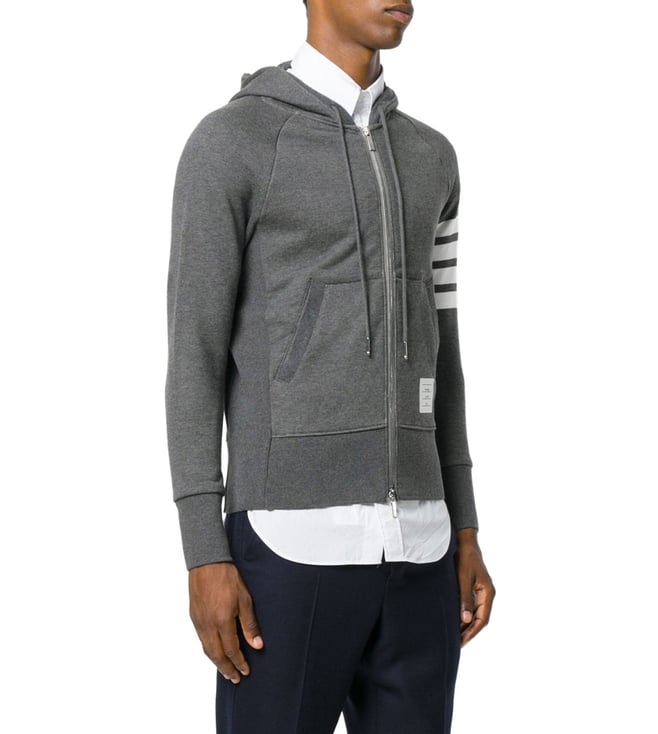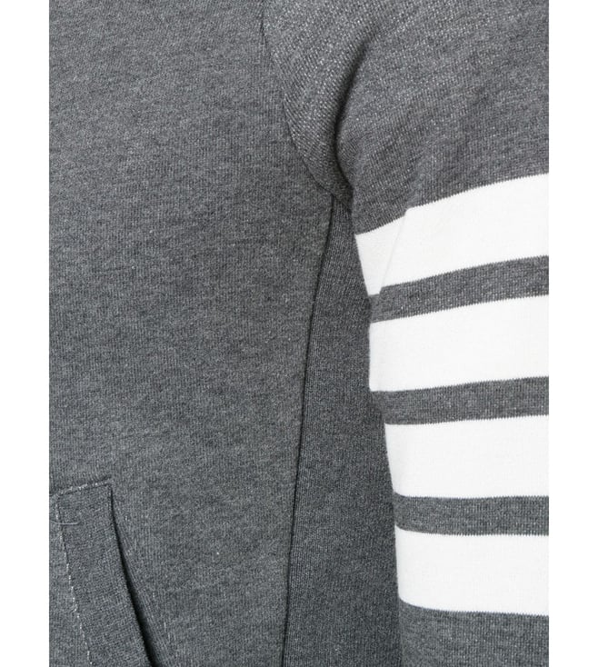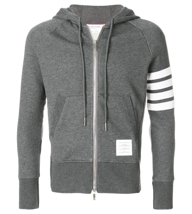 Elevate your style with the Thom Browne Grey Striped Hoodie. Grey cotton logo stripe hoodie from thom browne.