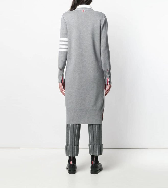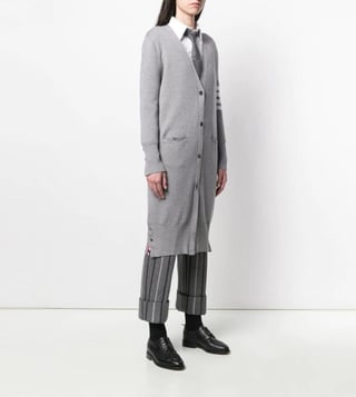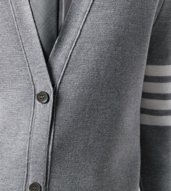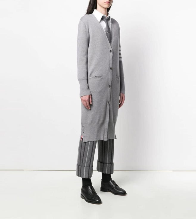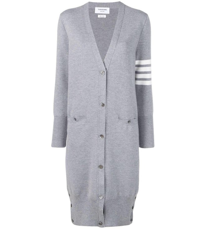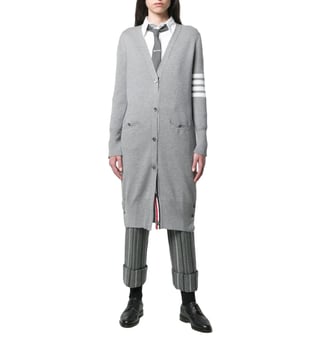 Embrace timeless elegance with the Thom Browne Light Grey Long V-Neck Cardigan, a masterpiece in 100% Virgin Wool. This exquisite piece, designed for women, showcases a subtle yet sophisticated color palette, perfect for any occasion. The cardigan features a classic V-neckline and a seamless closure, offering a refined silhouette. Its understated pattern adds a touch of modernity, making it a versatile addition to your wardrobe. Experience luxury and comfort in every thread with this iconic design.