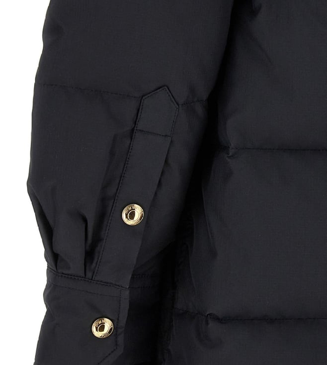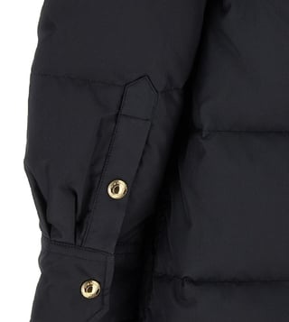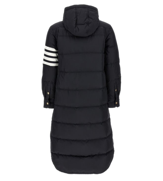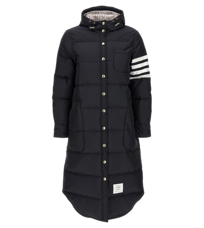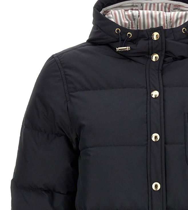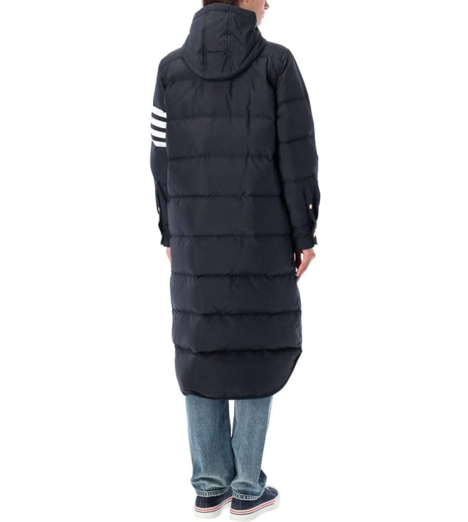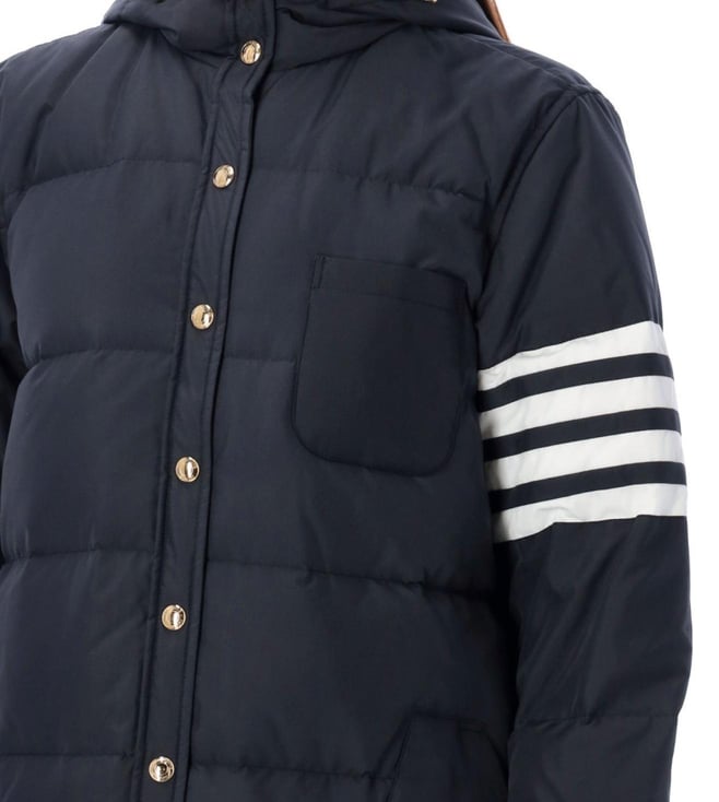 The Thom Browne Navy Blue Jacket is a masterstroke of sartorial elegance, blending classic tailoring with modern flair. Crafted from luxurious wool, its deep navy hue exudes sophistication, while the signature four-bar stripe on the sleeve adds a distinctive touch. The jacket features a structured silhouette with sharp lapels and a tailored fit, ensuring a commanding presence. Gold-tone buttons and a tricolor grosgrain loop at the back collar subtly nod to the brand's heritage, making it a timeless piece for the discerning dresser.
