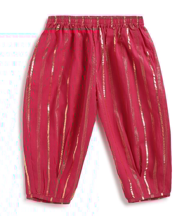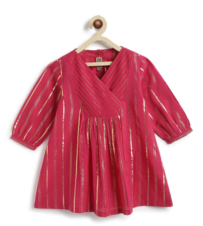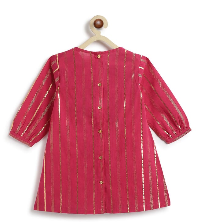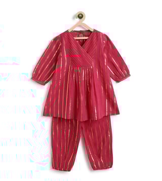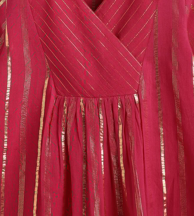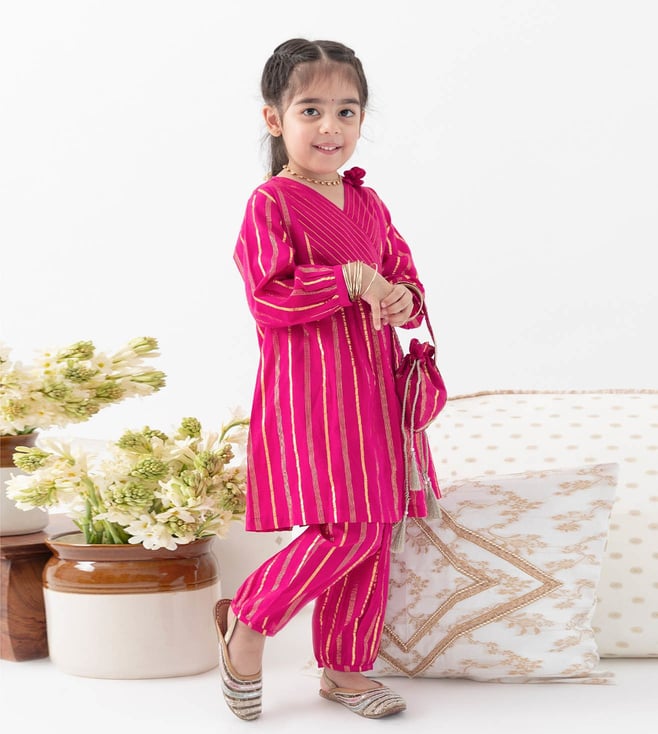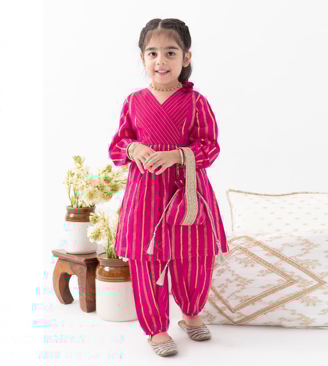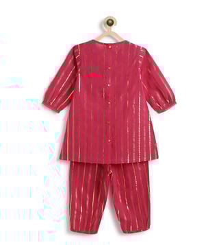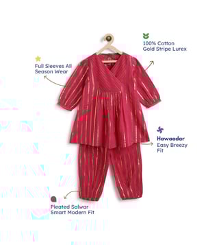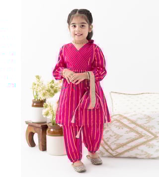 It¿s a bit of a cliche but girls are just happier in PINK! This beautiful fuchsia kurta set is made for mini divas who love the spotlight. Crafted in a rich lurex stripe fabric, the kurti features a cross-over V-neck and pleated flare that gives it a graceful swing. Paired with comfy box pleat salwar, it¿s bright, breathable, and brings big festive energy in a tiny package. Contents: 1 Kurti, 1 Salwar Fabric: Soft cotton with self-woven Lurex stripes Details: Unique color-block yoke with sequin lace trims and box pleat salwar