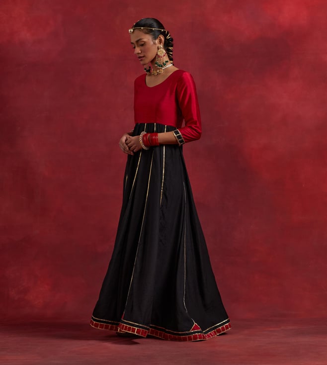 Embrace your ethnic side with this stunning Red Black Raw Silk and Chanderi Ghoomar Kurta Set by TIC. Perfect for women, this set comes with a 3/4th sleeve design, making it suitable for any occasion. Add this to your collection for a touch of elegance and style.' Disclaimer: All other items in the image are only for display purposes and will not be a part of the delivery content. Product colour may slightly vary due to photographic lighting sources. Country of Origin - India.