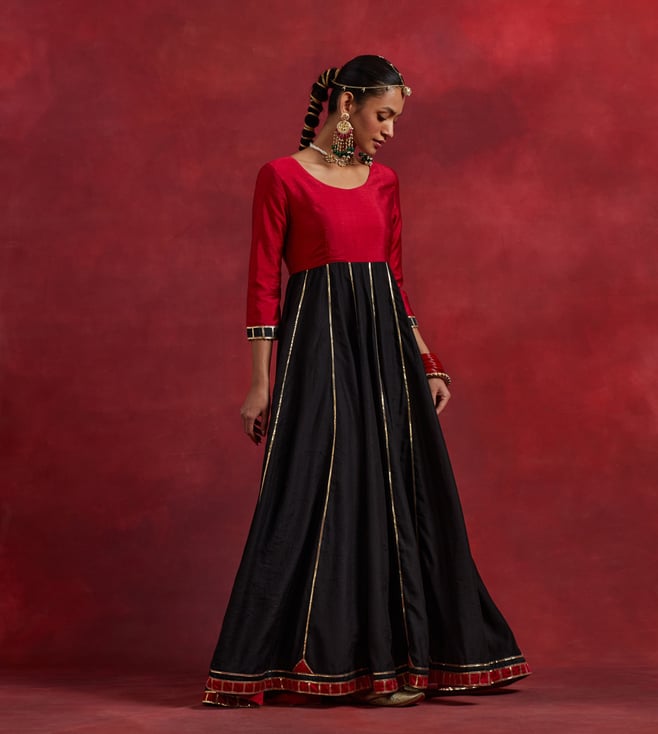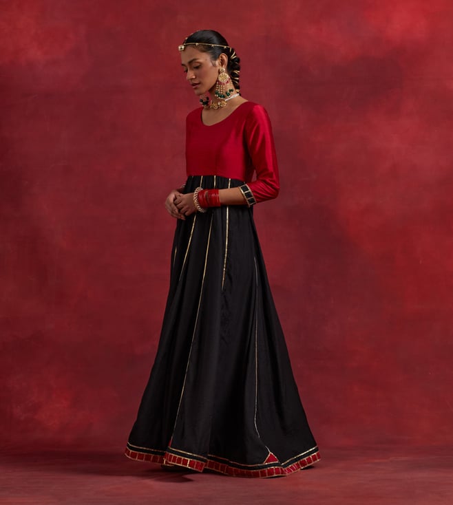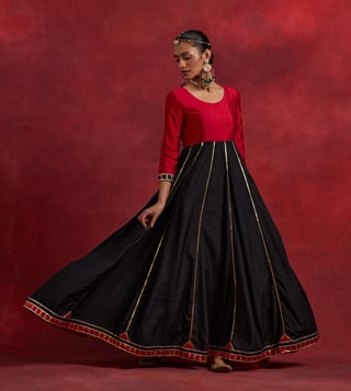 Add a touch of elegance to your ethnic collection with this stunning Red Black Raw Silk and Chanderi Ghoomar Kurta from TIC. The 3/4th sleeves add a feminine touch, making it perfect for any festive occasion.' Disclaimer: All other items in the image are only for display purposes and will not be a part of the delivery content. Product colour may slightly vary due to photographic lighting sources. Country of Origin - India.
