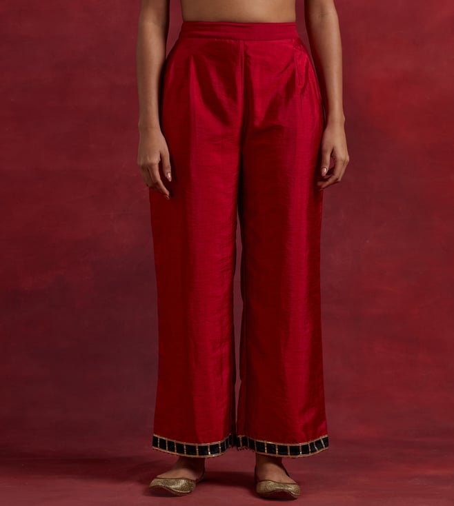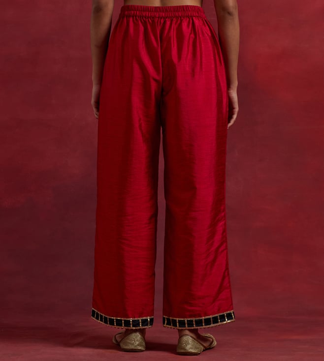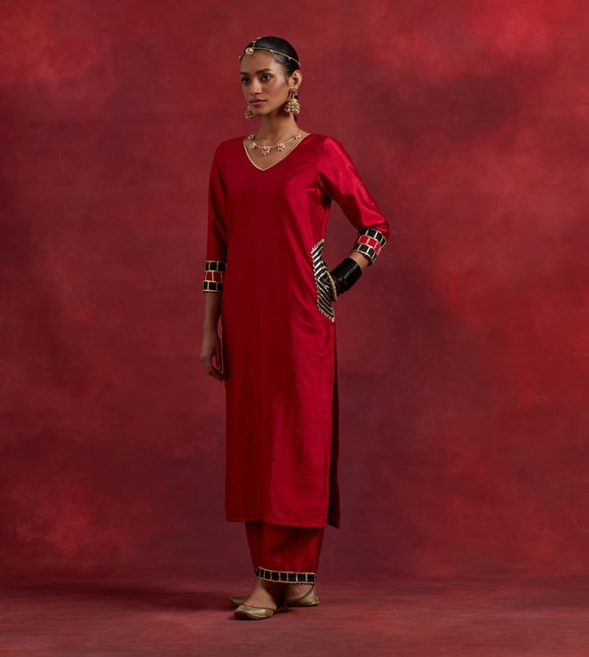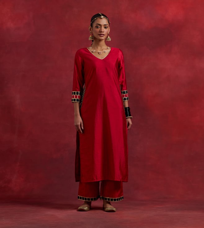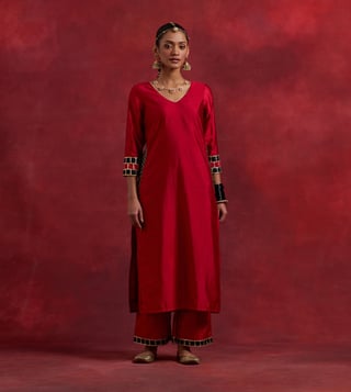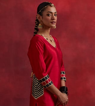 Elevate your ethnic wardrobe with TIC Red Black Raw Silk Mira Kurta Set. Made from premium quality raw silk, this set features a 3/4th sleeve kurta and is perfect for any traditional occasion.' Disclaimer: All other items in the image are only for display purposes and will not be a part of the delivery content. Product colour may slightly vary due to photographic lighting sources. Country of Origin - India.