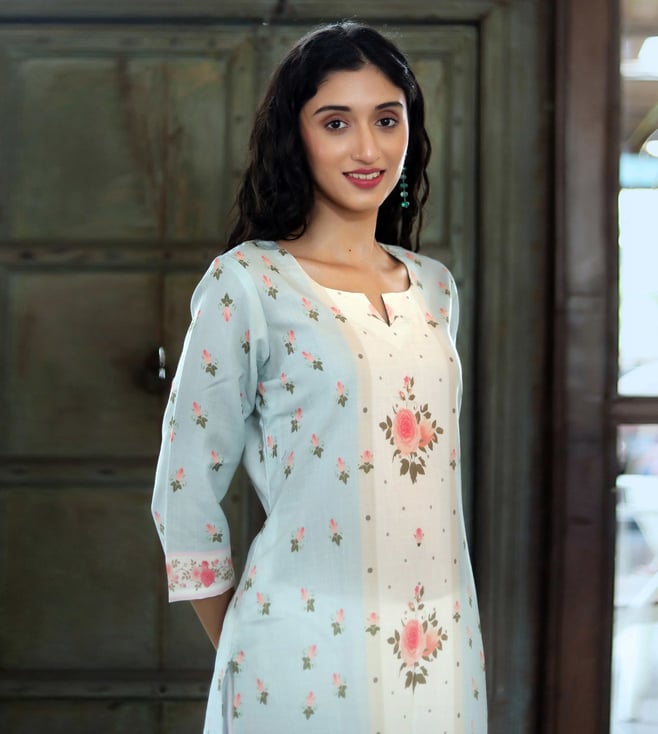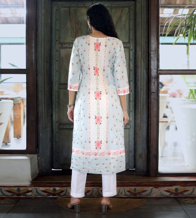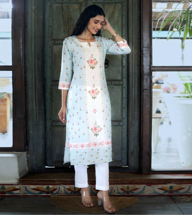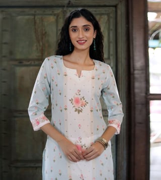 The Tina Eapen Blue Teal Cotton Straight Fit Floral Kurta This Women'S Dress Combines Traditional Fabric With Vibrant Colors For A Unique Style. Disclaimer: All Other Items In The Image Are Only For Display Purposes And Will Not Be A Part Of The Delivery Content. Product Colour May Slightly Vary Due To Photographic Lighting Sources. Country Of Origin - India.