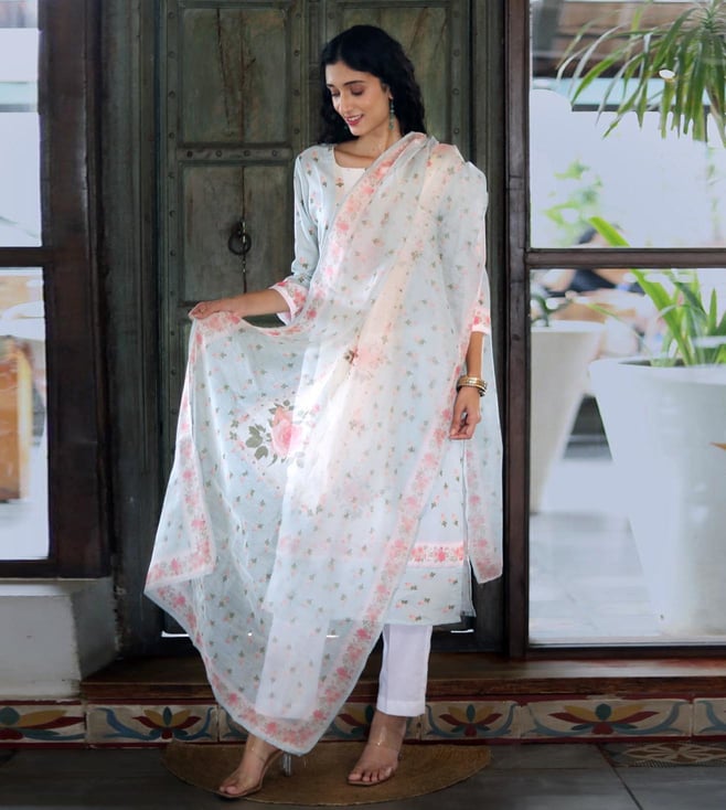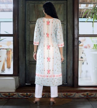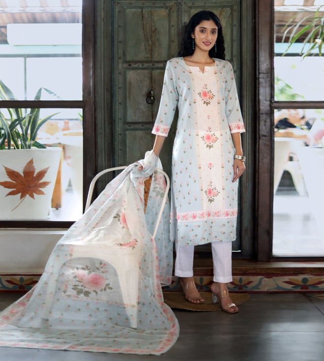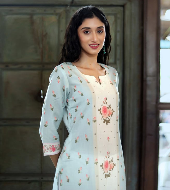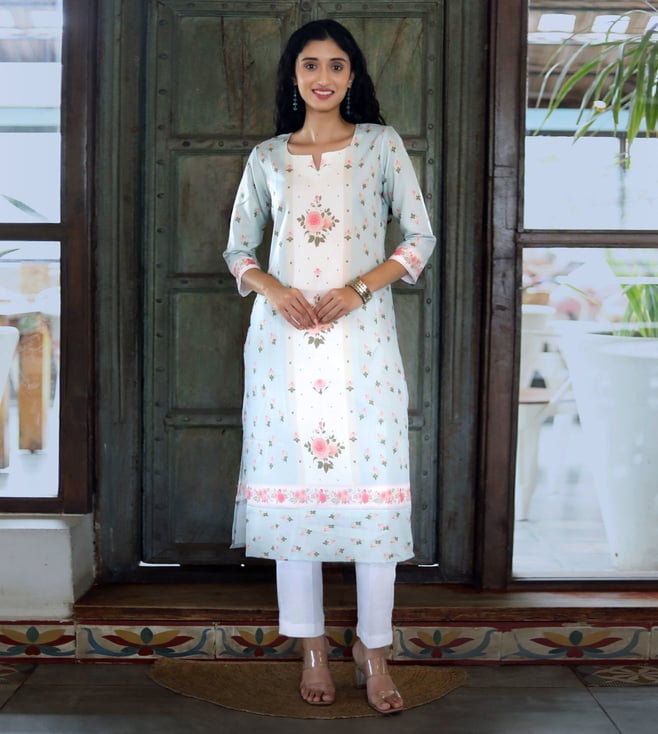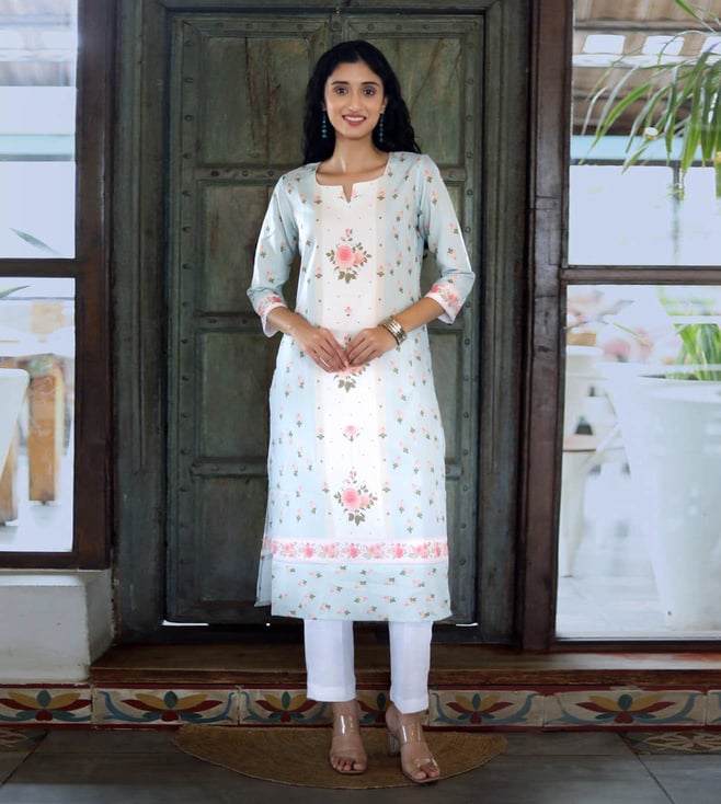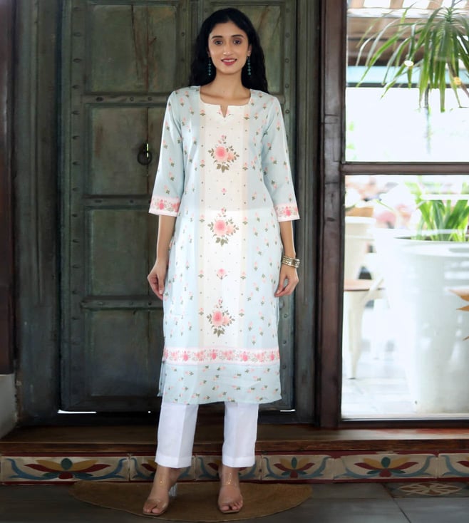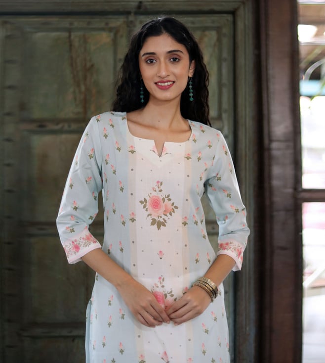 Experience Tina Eapen Blue Teal Cotton Straight Fit Floral Suit Set Comfort And Style With The Perfect For Any Occasion, Designed For Women, This Dress Combines Tradition And Elegance. Disclaimer: All Other Items In The Image Are Only For Display Purposes And Will Not Be A Part Of The Delivery Content. Product Colour May Slightly Vary Due To Photographic Lighting Sources. Country Of Origin - India.