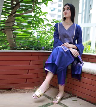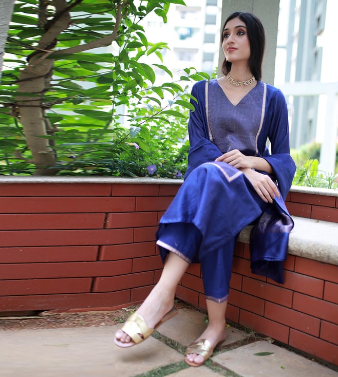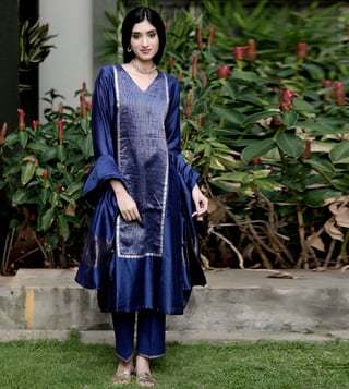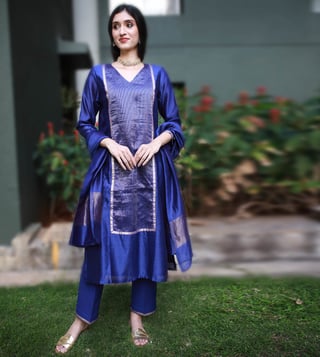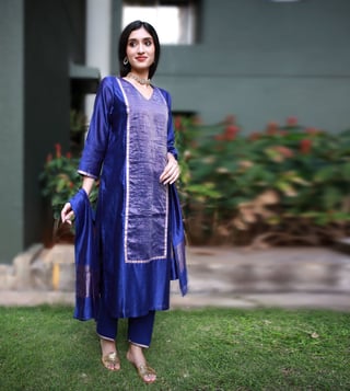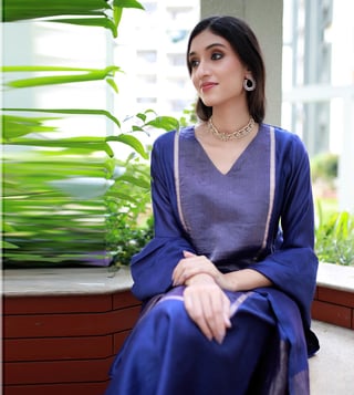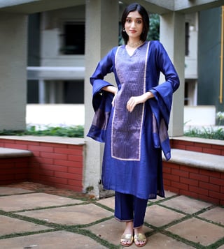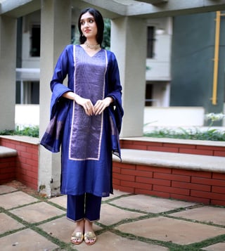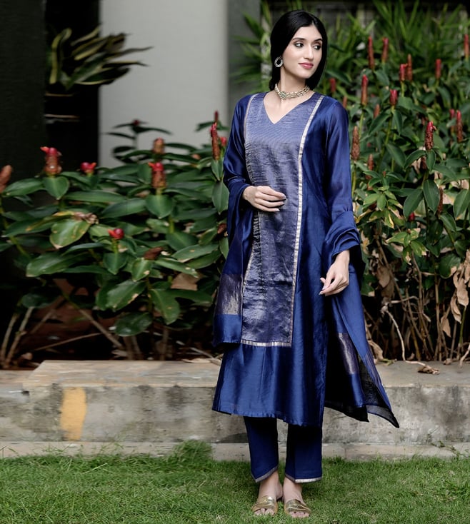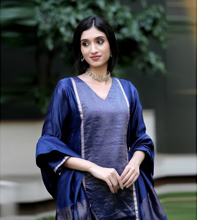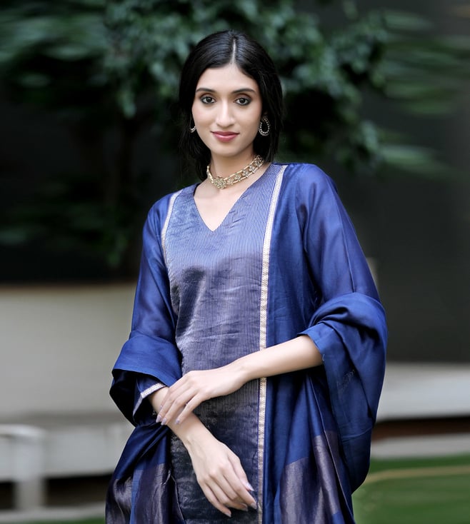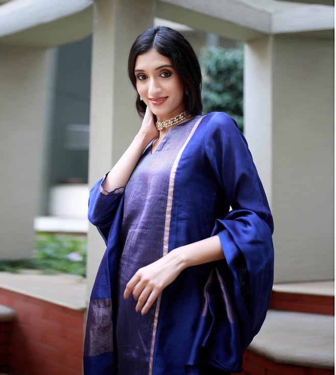 Tina Eapen Silken Cobalt Handwoven Chanderi And Woven Silk Tissue Relaxed Fit Kurta Set