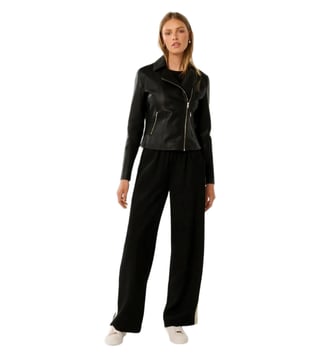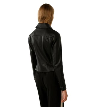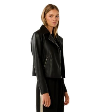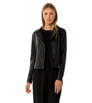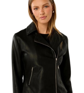 Elevate your wardrobe with the Forever New Tina Faux Leather Biker Jacket, a perfect blend of feminine glamour and edgy style. Crafted from smooth faux leather, this jacket features notched lapels, an asymmetrical zip front, and pintucked detailing for a retro charm. With a regular fit and zip-up side pockets, it offers both style and functionality. The jacket is lined and made from vegan-friendly materials, ensuring a cruelty-free fashion statement.