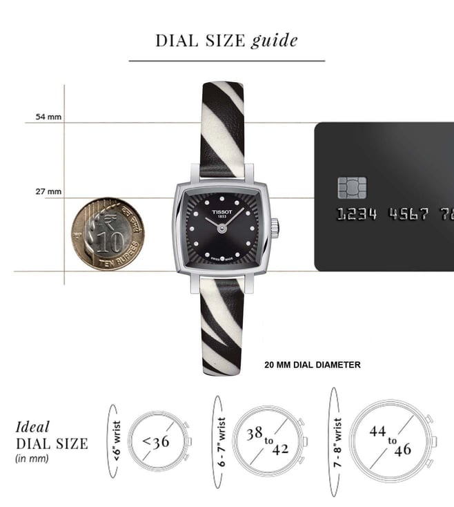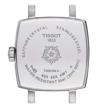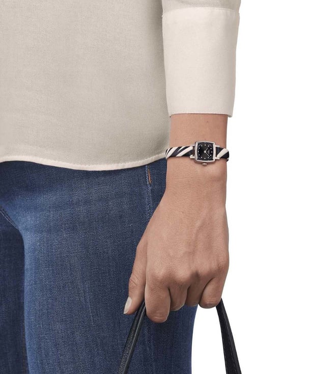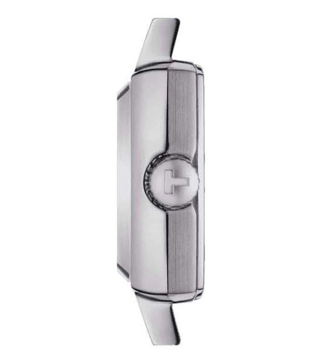 Make a distinct style statement wearing this women's watch from the T-Lady collection by Tissot. Enclosed in a 20 mm case, the square dial is secured by a scratch-resistant sapphire crystal. It displays plain two hands and a crown for time adjustment. The strap is crafted with care using synthetic that gives a good finish.