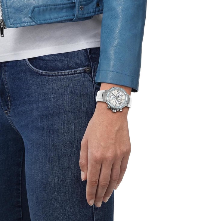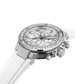This Swiss Quartz watch features a 38.0mm round dial with Sapphire Crystal and a silicon strap. Its sleek design and reliable movement make it an elegant choice for everyday wear.