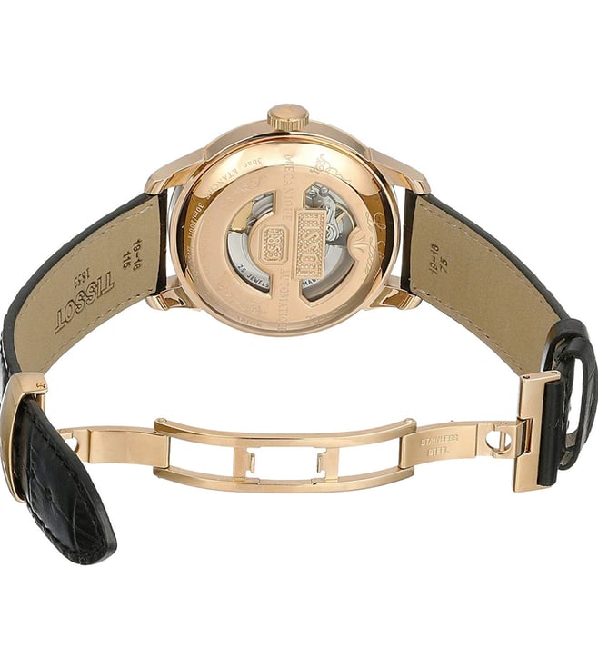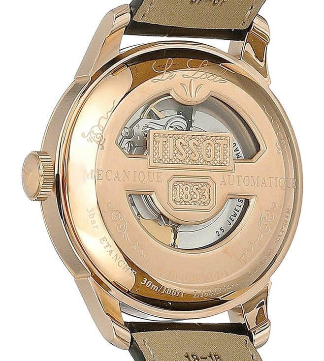 Experience timeless elegance with the Tissot Le Locle women's watch, a Swiss-made masterpiece. Featuring automatic movement and a pull and push crown for precise timekeeping, the Yellow Gold PVD stainless steel case houses a luminescent Mother-of-Pearl dial, protected by scratch-resistant sapphire crystal. The watch also offers a 30m water resistance and a practical date feature, complemented by an exhibition case back. The chic black leather strap adds to its sophistication. Made in Switzerland, this Tissot watch combines functionality and style. Model: T41542393.