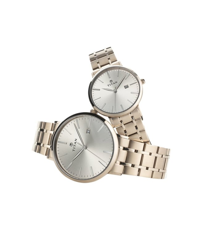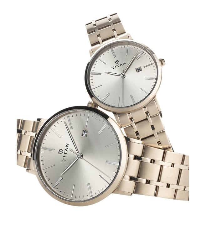 Merging contemporary style with performance, this pair of analog watches from the Modern Pair II collection by Titan will be a perfect pick for a couple. The metal straps showcase a champagne gold hue that uplifts the look of the watches. Safeguarded by a mineral glass and functional on a quartz movement, the silver round dials features plain three hands, bold stick indices, a date display window at the 3rd-hour position and a crown for time adjustment.