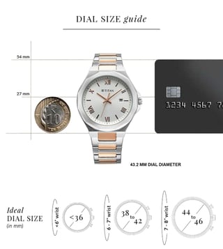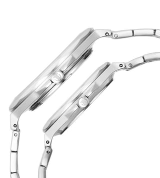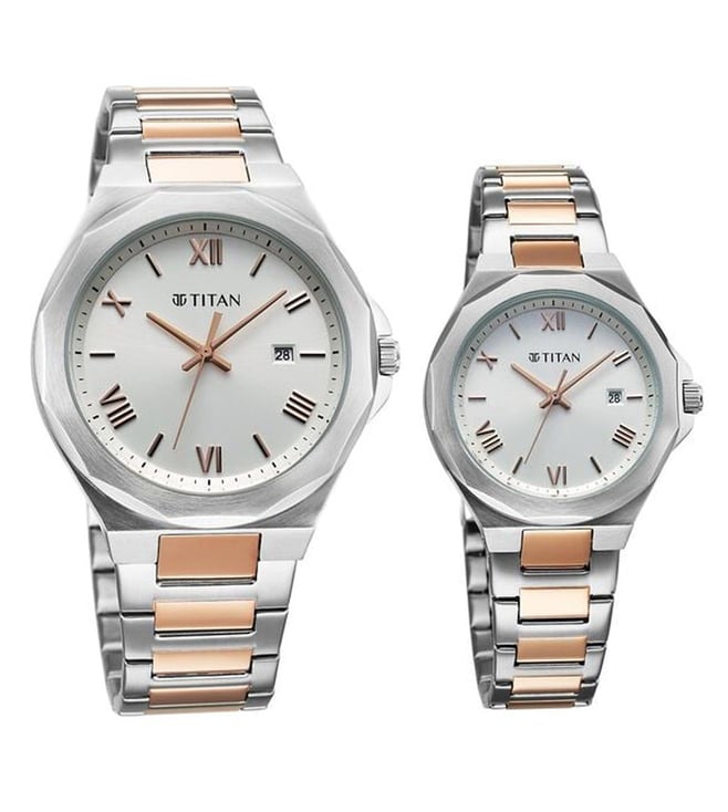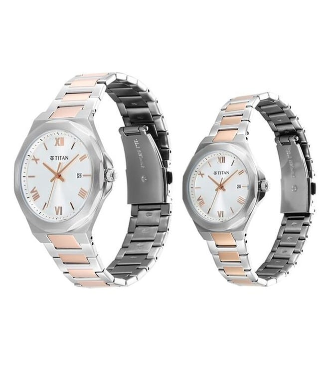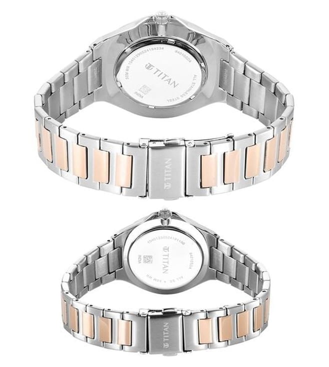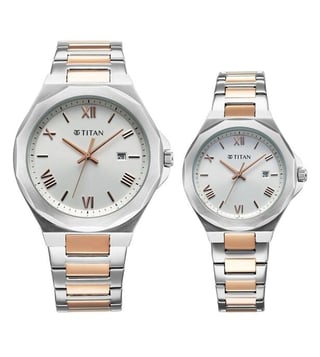 A must-have timepiece for all the watch aficionados, this couple's Analog watch from the collection by Titan will be a perfect pick. The silver round dial is protected by a Sapphire Glass. It features a crown for time adjustment. The stainless steel strap comes in a two tone hue that further elevates the look of the timekeeper. Besides, it is completed with a push button clasp to ensure a secure fit on the wrist.