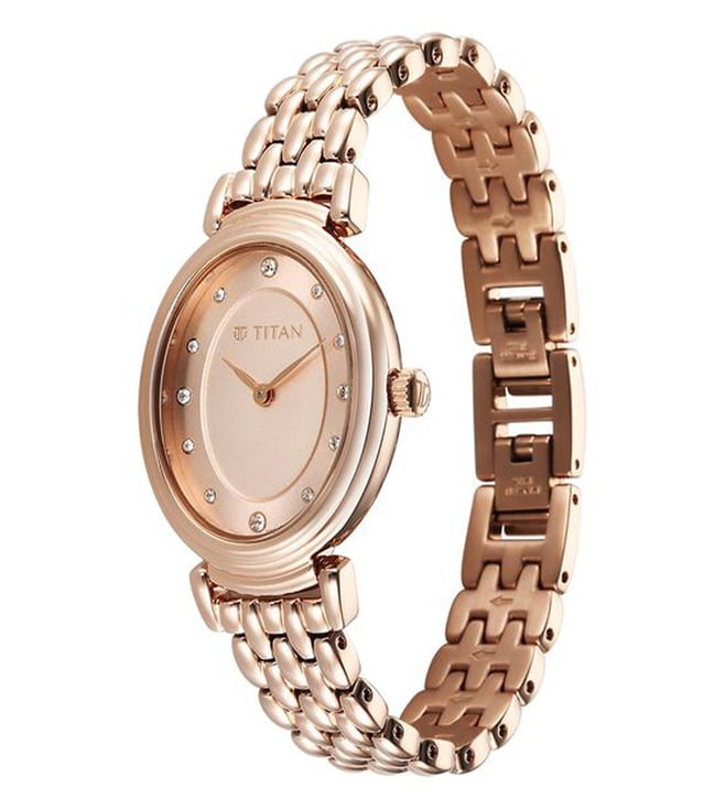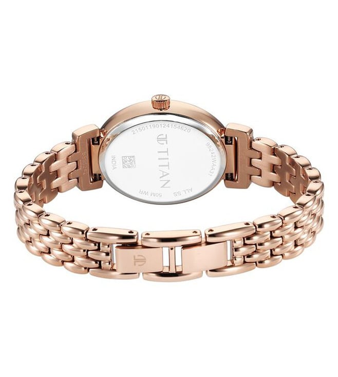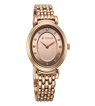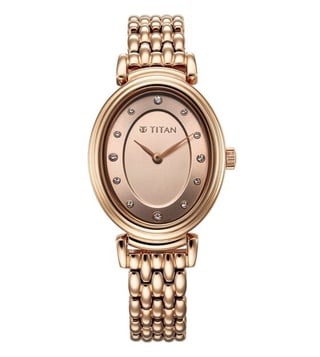 Amaze everyone around you by wearing this women's Analog watch from the collection by Titan. The rose gold others dial is protected by a Sapphire Glass. It features a crown for time adjustment. The stainless steel strap comes in a rose gold hue that further elevates the look of the timekeeper. Besides, it is completed with a jewellery clasp to ensure a secure fit on the wrist.