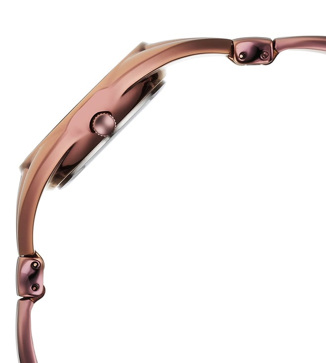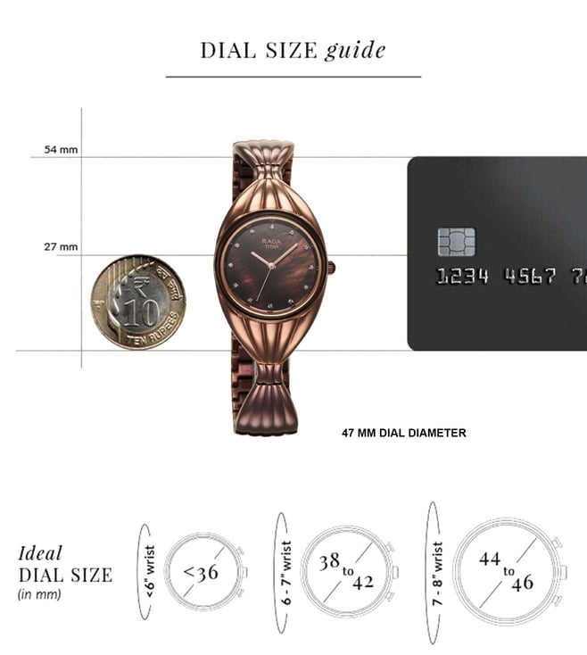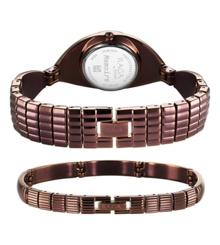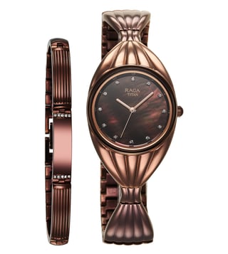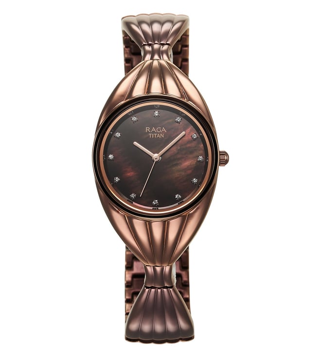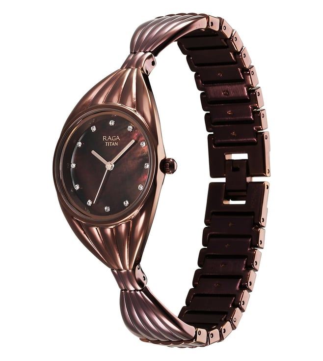 Add a stylish dimension to your look by wearing this women's analog watch from the collection by Titan. The brown round dial is protected by a mineral glass. It features a crown for time adjustment. The metal strap comes in a brown hue that further elevates the look of the timekeeper. Besides, it is completed with a jewellery clasp to ensure a secure fit on the wrist.