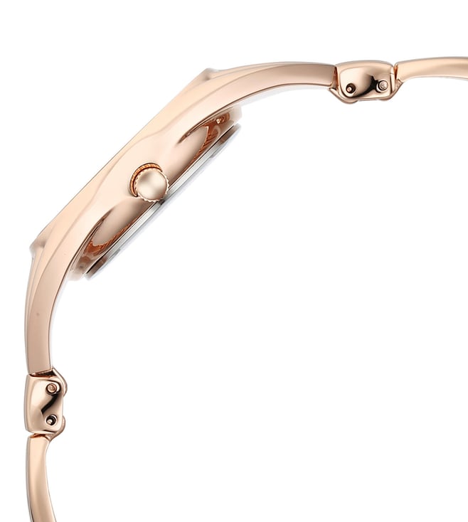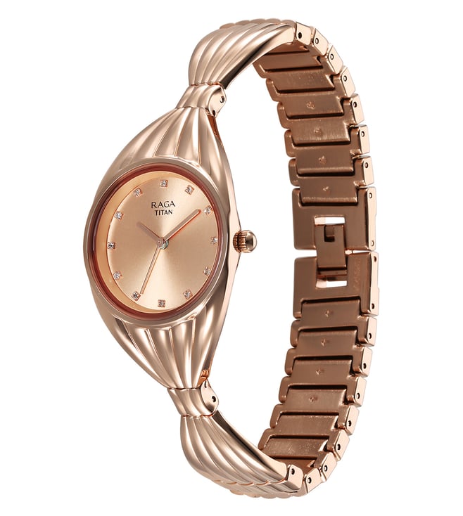 A must-have timepiece for all the watch aficionados, this women's analog watch from the collection by Titan will be a perfect pick. The rose gold round dial is protected by a mineral glass. It features a crown for time adjustment. The metal strap comes in a rose gold hue that further elevates the look of the timekeeper. Besides, it is completed with a jewellery clasp to ensure a secure fit on the wrist.