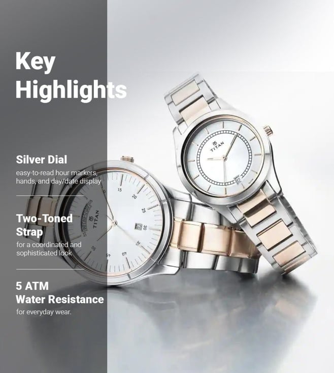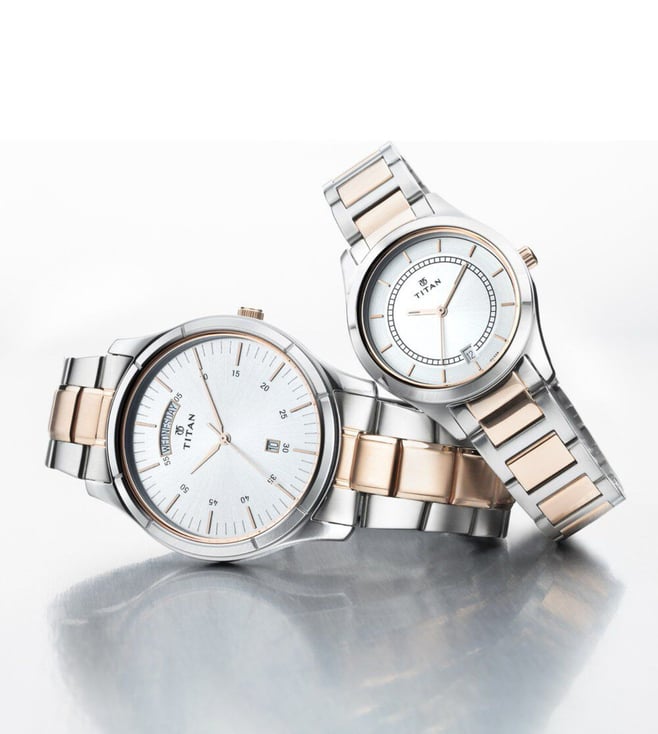 A must-have timepiece for all the watch aficionados, this couple's analog watch from Titan will be a perfect pick. The silver round dial is housed in a case. It exhibits and a crown for time adjustment. The stainless steel strap comes in a two tone hue that further elevates the look of the timekeeper. Moreover, it is equipped with a fold-over clasp with double push button safety clasp to ensure a secure fit on the wrist.