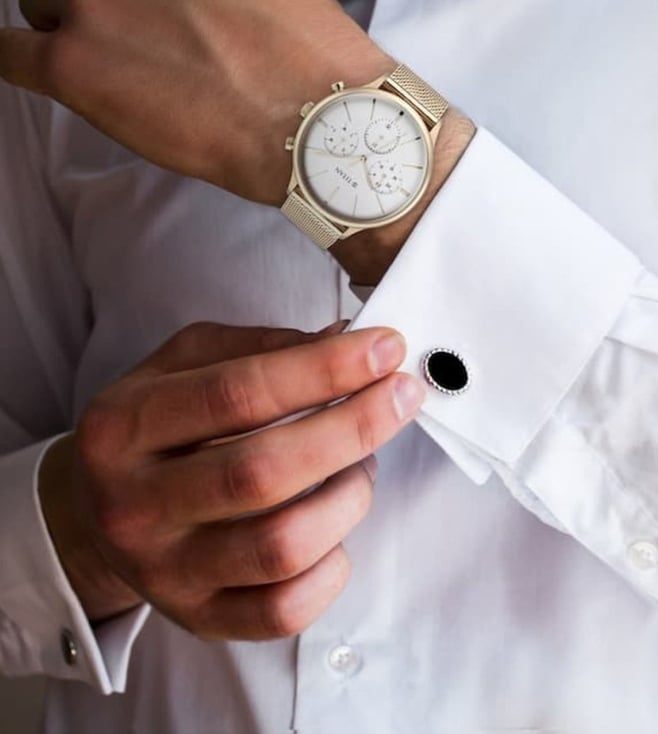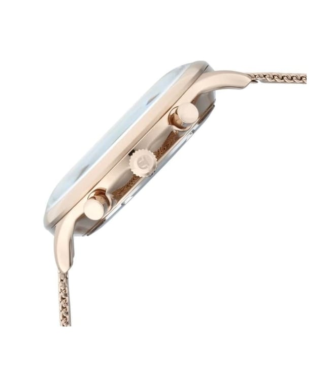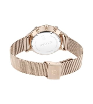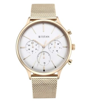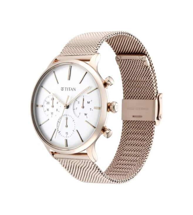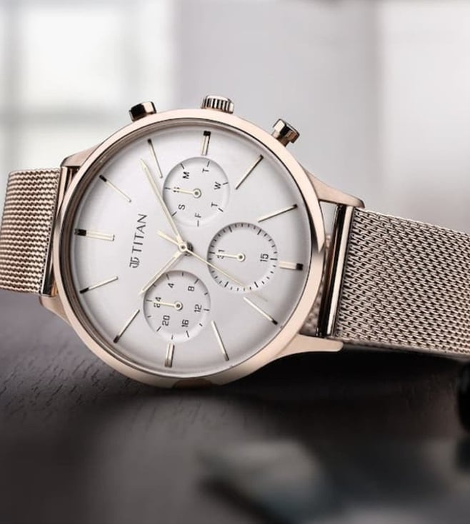 Designed to suit the preference of urban men, this analog watch from Titan is sure to make a style statement. The silver round dial is protected by a mineral glass. The leather strap comes in a rose gold hue that further elevates the look of the timekeeper. Besides, it is completed with a deployment clasp to ensure a secure fit on the wrist.