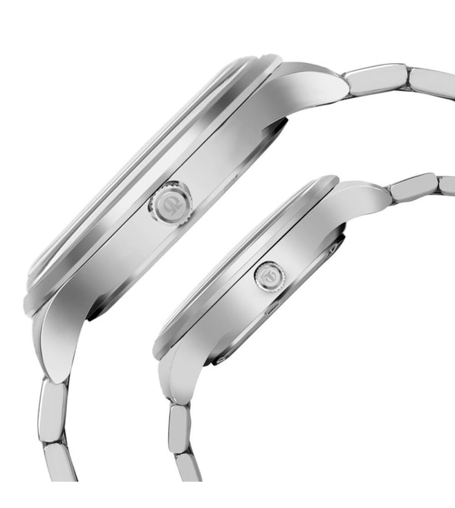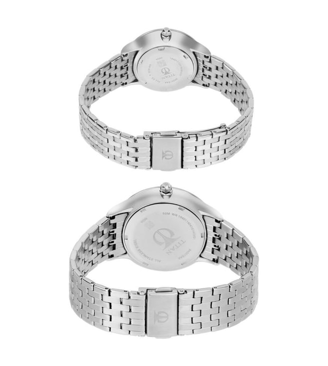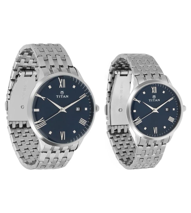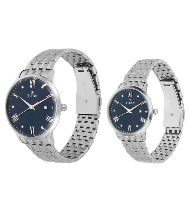 Reflecting the dynamism of modern lifestyles, this couple's analog watch from Titan will be a great addition to your collection of watches. The blue round dial is housed in a case. It exhibits and a crown for time adjustment. The stainless steel strap comes in a silver hue that further elevates the look of the timekeeper. Moreover, it is equipped with a fold-over clasp with double push button safety clasp to ensure a secure fit on the wrist.