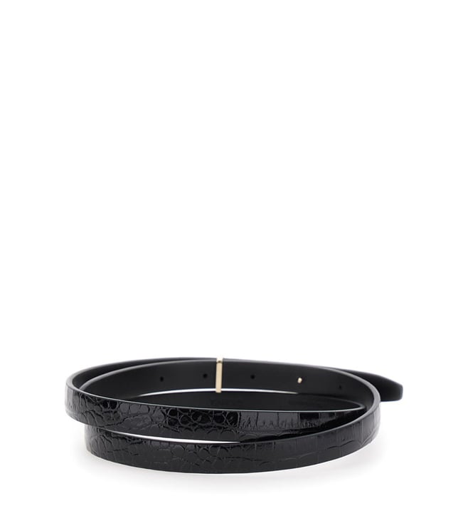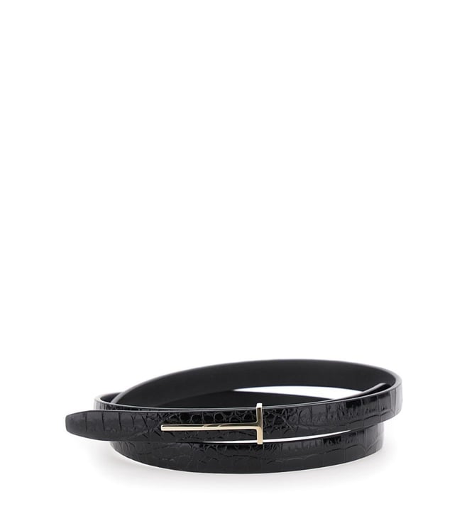 Tom Ford Black Logo Buckle Textured Belt: Black textured T-buckle fastening punched holes Leather belt. Products purchased from Darveys are supported exclusively by the warranty/exchange policies of Darveys and its partner boutiques. Brand owners and their channel partners are not responsible for exchange/warranty services for items purchased through Darveys.