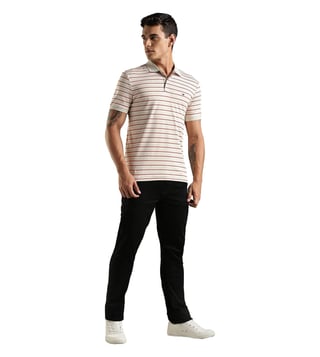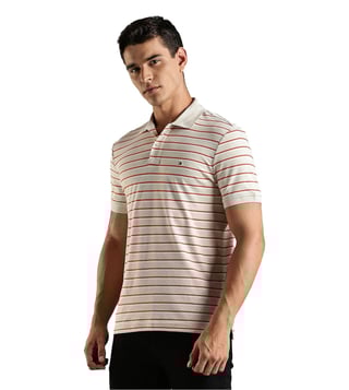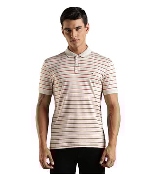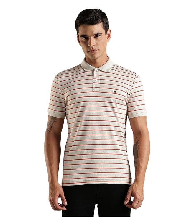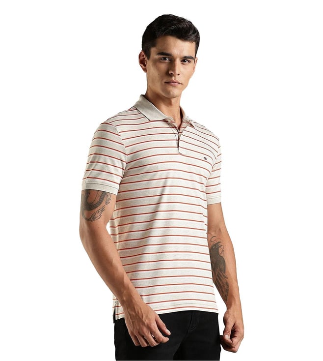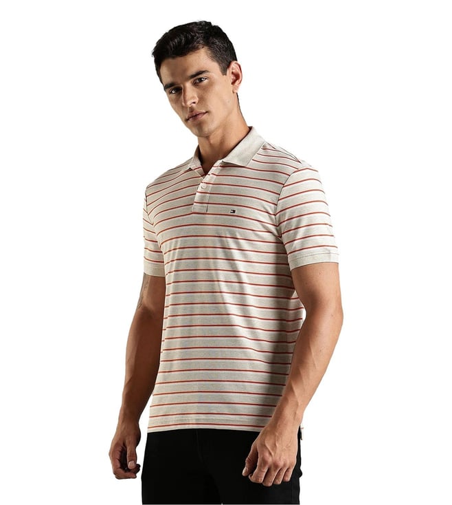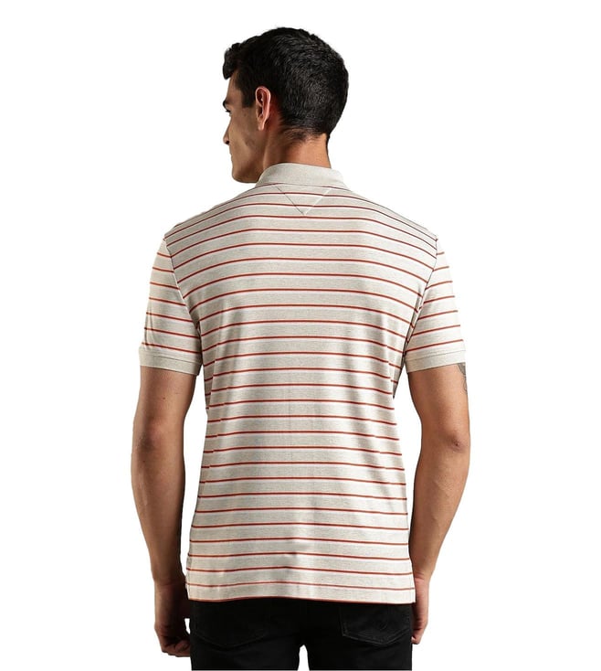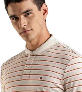 TOMMY HILFIGER Beige Cotton Regular Fit Striped Polo T-Shirt